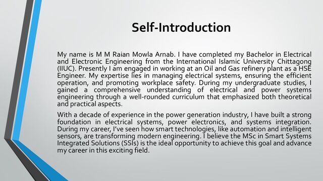 have completed my Bachelor in Electrical and Electronic Engineering from the International Islamic University Chittagong (IIUC). Presently I am engaged in working at an Oil and Gas refinery plant as a HSE Engineer. My expertise lies in managing electrical systems, ensuring the efficient operation, and promoting workplace safety. During my undergraduate studies, I gained a comprehensive understanding of electrical and power systems engineering through a well-rounded curriculum that emphasized both theoretical and practical aspects. With a decade of experience in the power generation industry, I have built a strong foundation in electrical systems, power electronics, and systems integration. During my career, I’ve seen how smart technologies, like automation and intelligent sensors, are transforming modern engineering. I believe the MSc in Smart Systems Integrated Solutions (SSIs) is the ideal opportunity to achieve this goal and advance my career in this exciting field.