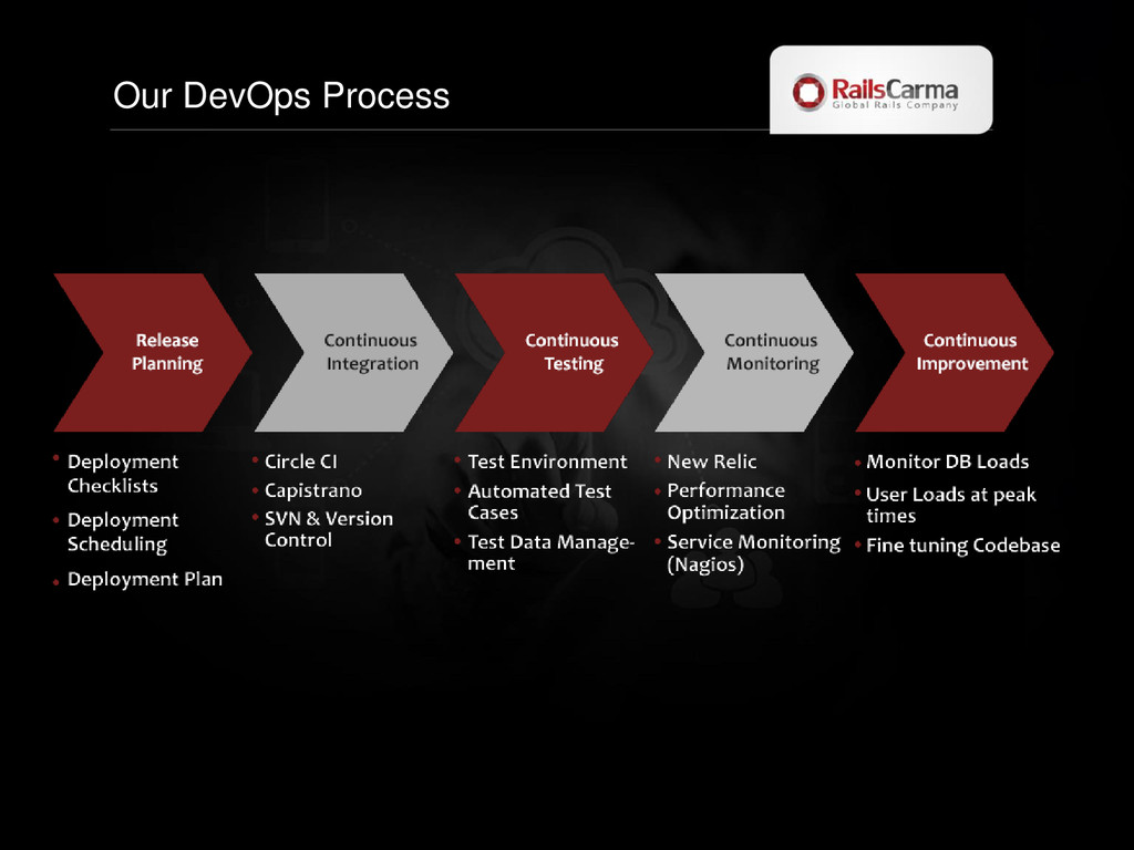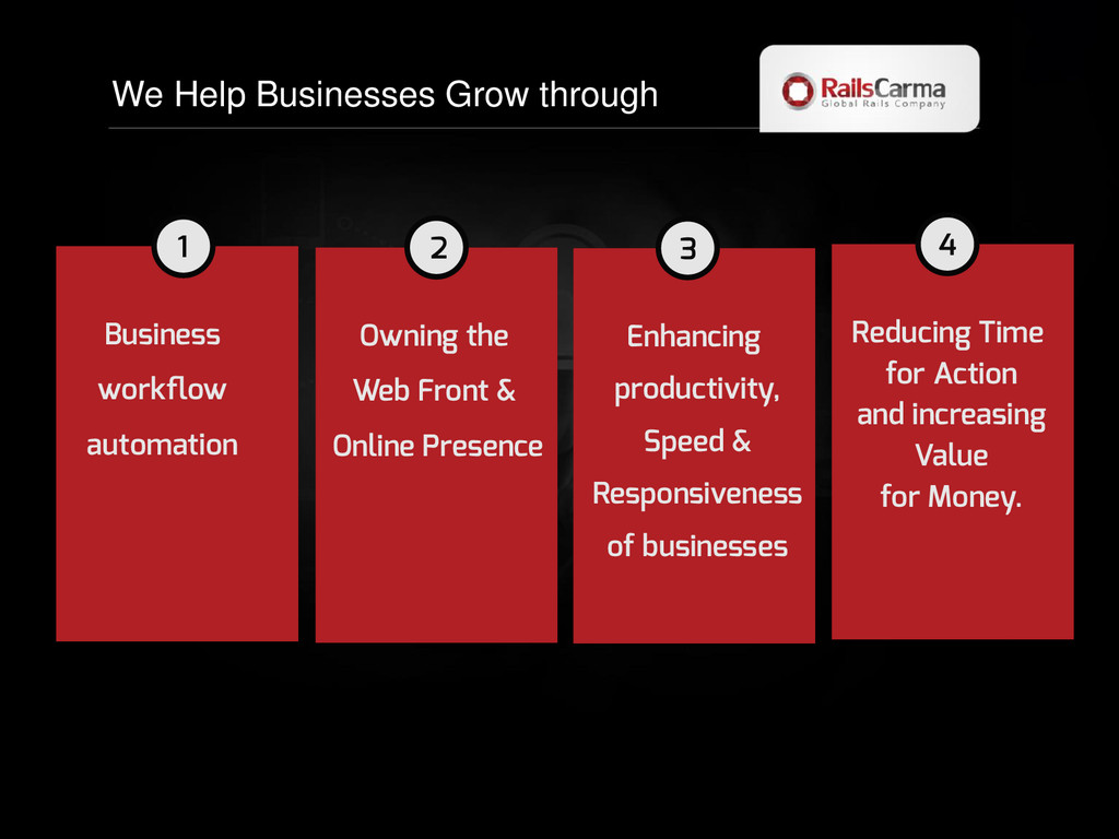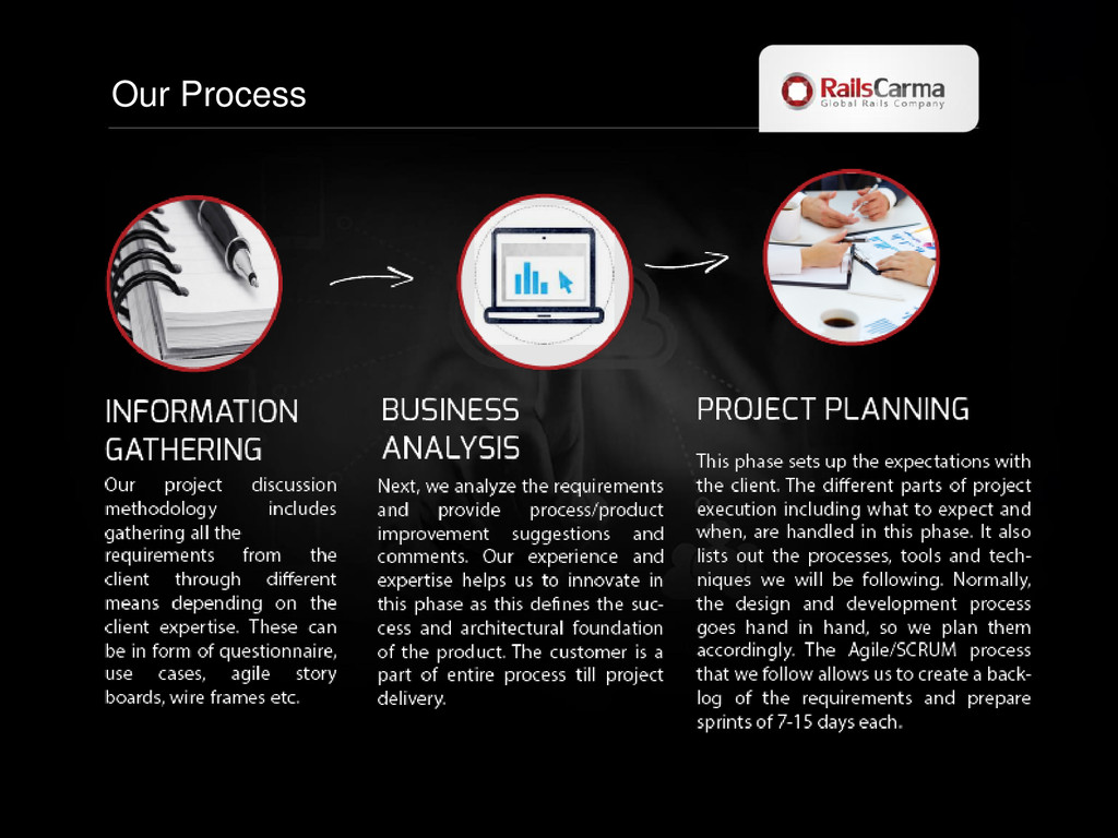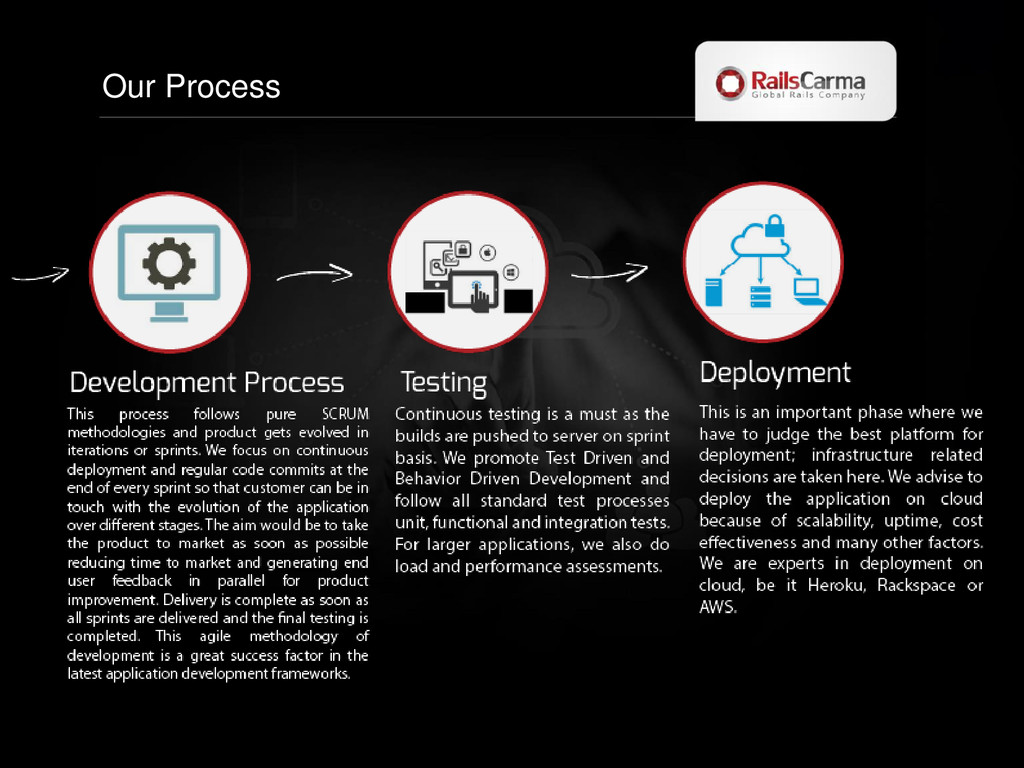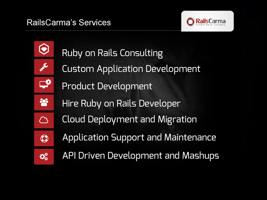 RailsCarma provides end to end Ruby on Rails consulting to companies around the globe. We support our clients with tools, techniques and innovative approaches to solve mission critical business problems.We provide all types of RoR consulting services such as - Process Review, Cloud Deployment, Consulting.