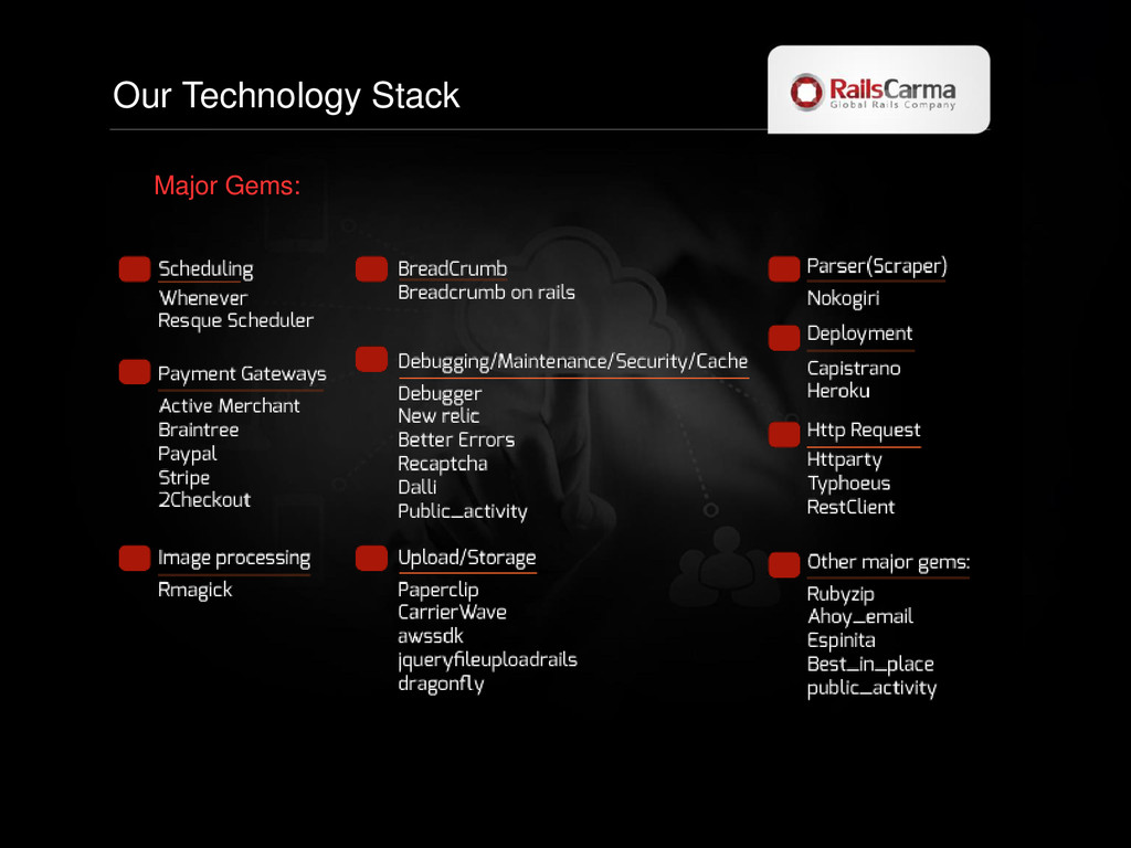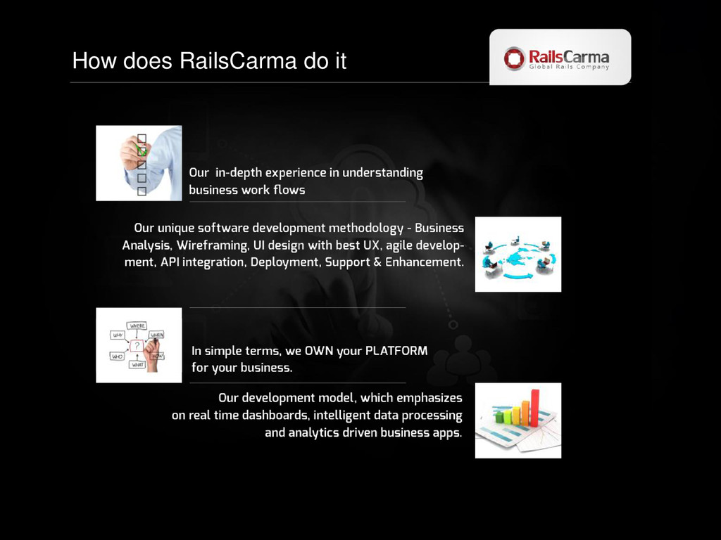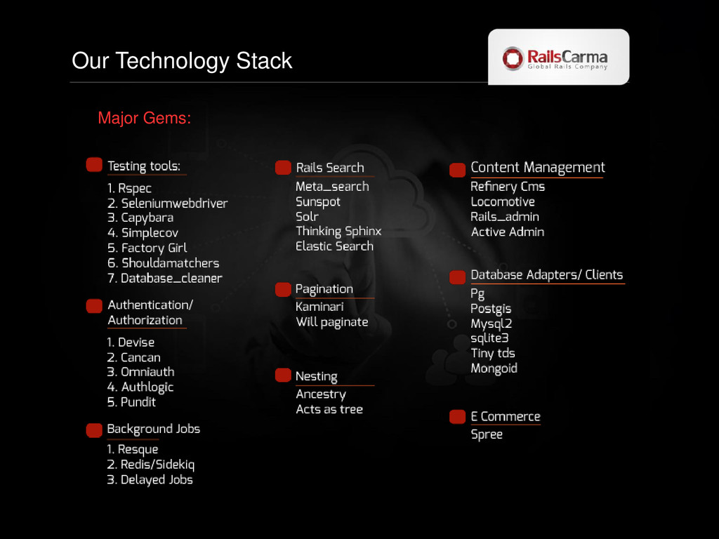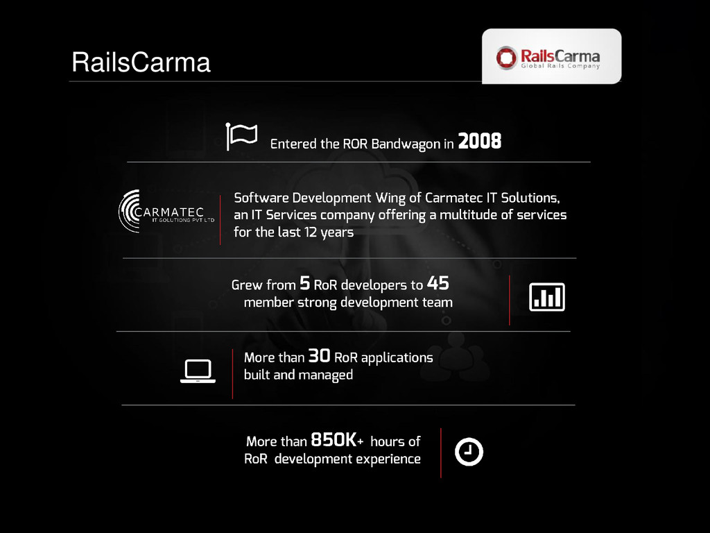 RailsCarma is a Ruby on Rails Development Company specializing in Offshore Ruby on Rails Development based out in USA and India. Hire experienced Ruby on Rails developers for the ultimate Web Experience.