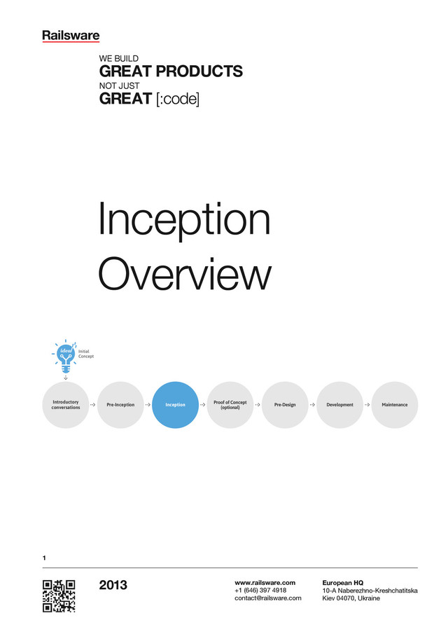 absolutely great way to effectively start the production process. And in order for the Inception to go faster and smoother, we usually have a few preliminary interactions with the client to make sure that we have enough data on both sides to kick off.Below is the checklist of details we ask our clients to prepare in advance. Introduction stakeholders involved in the product, their responsibility and contact info. Prepare for demo wireframes, mockups, screenshots of apps you like (similar features, design); competitor products; screens, pictures, real-life stories, scenarios; additionally to all the information above - any information you have/want to show, presentation, specification. Goals/risks consumer focus who are the real life roles (@Lawyer, @Traveller, @Sales rep, @Driver); issues/benefits/risks of those real-life roles. domain knowledge something a domain expert knows, but consumers lack knowledge of; something that will help consumers resolve their issues, create benefits, mitigate risks. business goals anything that can change the way the application should be made for the business; benefits/issues/risks - toward the business; biz/tech; revenue model, leads generation, marketing model; terms (when to start, when to get it delivered), partners, integrations, contracts; budget. other goals any other issues/benefits/risks that didn't fall into categories above. 2013 www.railsware.com +1 (646) 397 4918