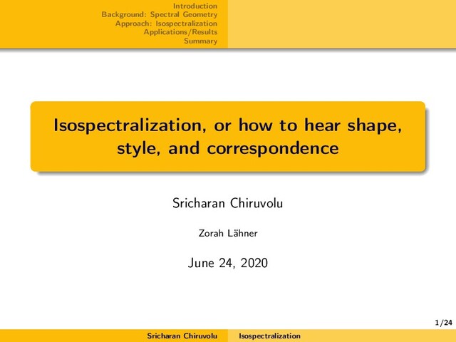 Published in CVPR 2019. Explores the practical possibility of using the spectrum of an object for shape reconstruction. Proposes an inverse mapping between geometric domain and its Laplacian via simple regularizers. Isospectralization: A numerical optimization procedure to deform a mesh in order to align its (finite) Laplacian spectrum with a given one. Sricharan Chiruvolu Isospectralization