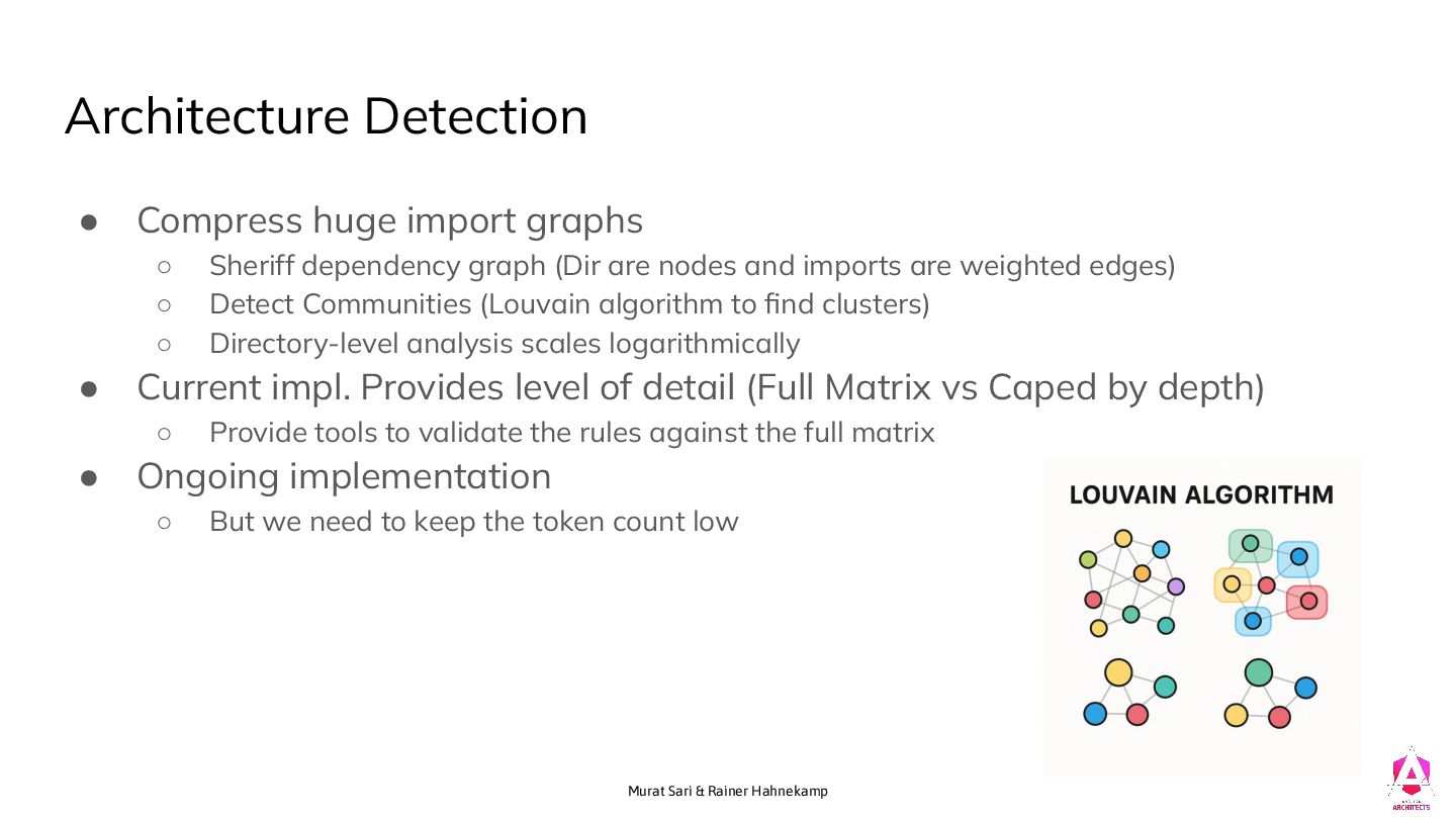 import graphs ◦ Sheriff dependency graph (Dir are nodes and imports are weighted edges) ◦ Detect Communities (Louvain algorithm to find clusters) ◦ Directory-level analysis scales logarithmically • Current impl. Provides level of detail (Full Matrix vs Caped by depth) ◦ Provide tools to validate the rules against the full matrix • Ongoing implementation ◦ But we need to keep the token count low