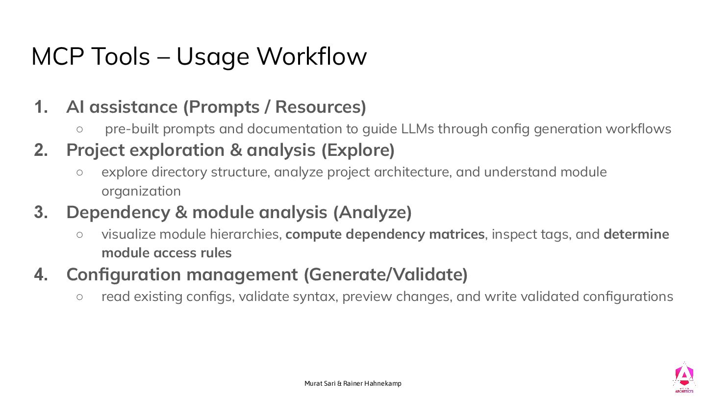 1. AI assistance (Prompts / Resources) ◦ pre-built prompts and documentation to guide LLMs through config generation workflows 2. Project exploration & analysis (Explore) ◦ explore directory structure, analyze project architecture, and understand module organization 3. Dependency & module analysis (Analyze) ◦ visualize module hierarchies, compute dependency matrices, inspect tags, and determine module access rules 4. Configuration management (Generate/Validate) ◦ read existing configs, validate syntax, preview changes, and write validated configurations