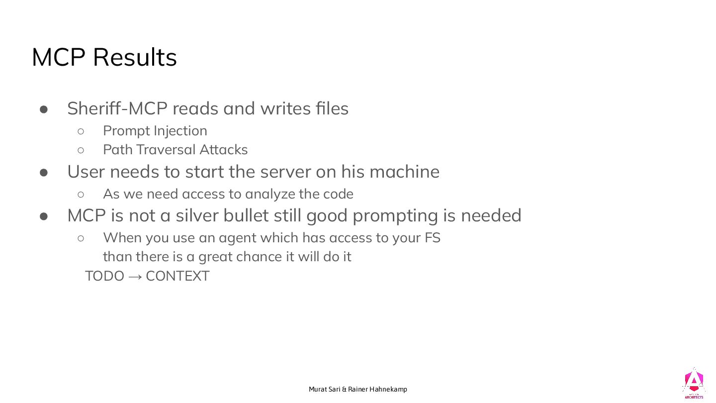 and writes files ◦ Prompt Injection ◦ Path Traversal Attacks • User needs to start the server on his machine ◦ As we need access to analyze the code • MCP is not a silver bullet still good prompting is needed ◦ When you use an agent which has access to your FS than there is a great chance it will do it TODO → CONTEXT