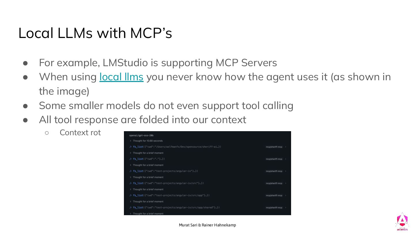 For example, LMStudio is supporting MCP Servers • When using local llms you never know how the agent uses it (as shown in the image) • Some smaller models do not even support tool calling • All tool response are folded into our context ◦ Context rot