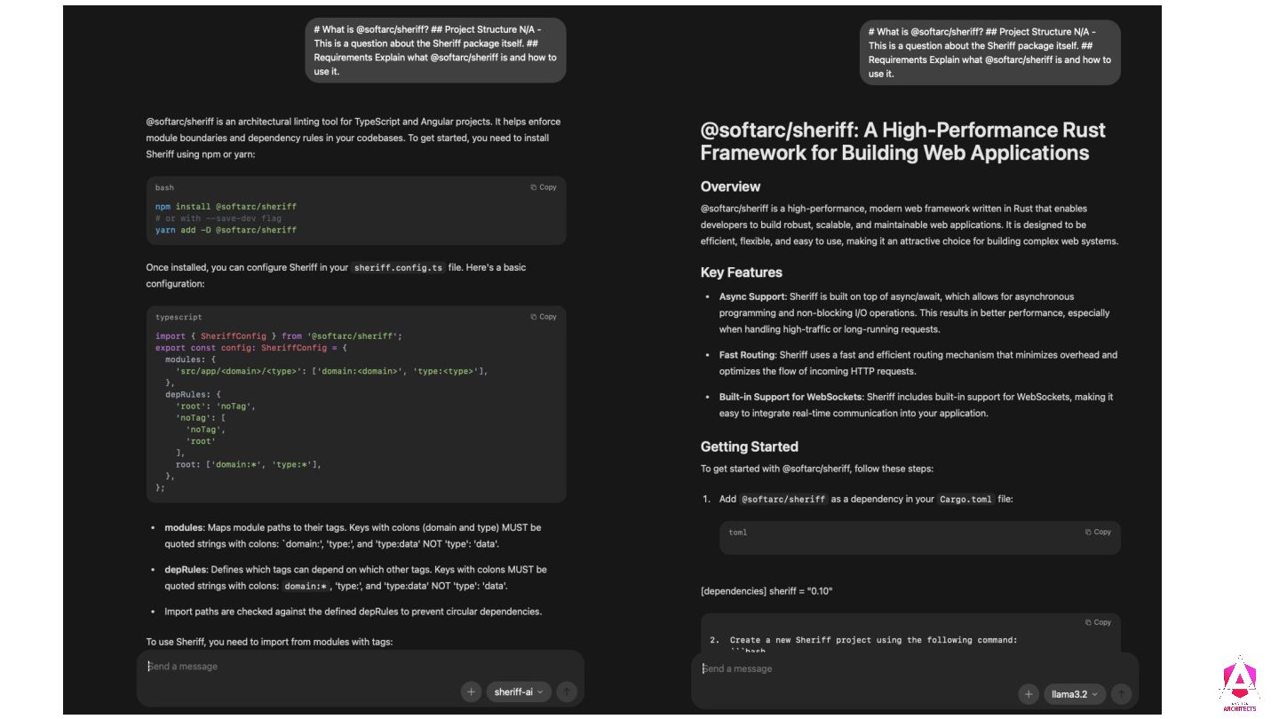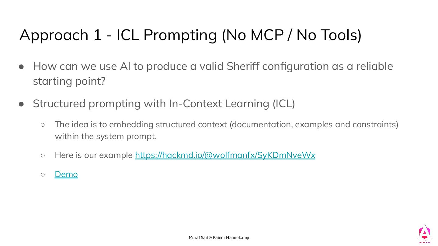 (No MCP / No Tools) • How can we use AI to produce a valid Sheriff configuration as a reliable starting point? • Structured prompting with In-Context Learning (ICL) ◦ The idea is to embedding structured context (documentation, examples and constraints) within the system prompt. ◦ Here is our example https://hackmd.io/@wolfmanfx/SyKDmNveWx ◦ Demo