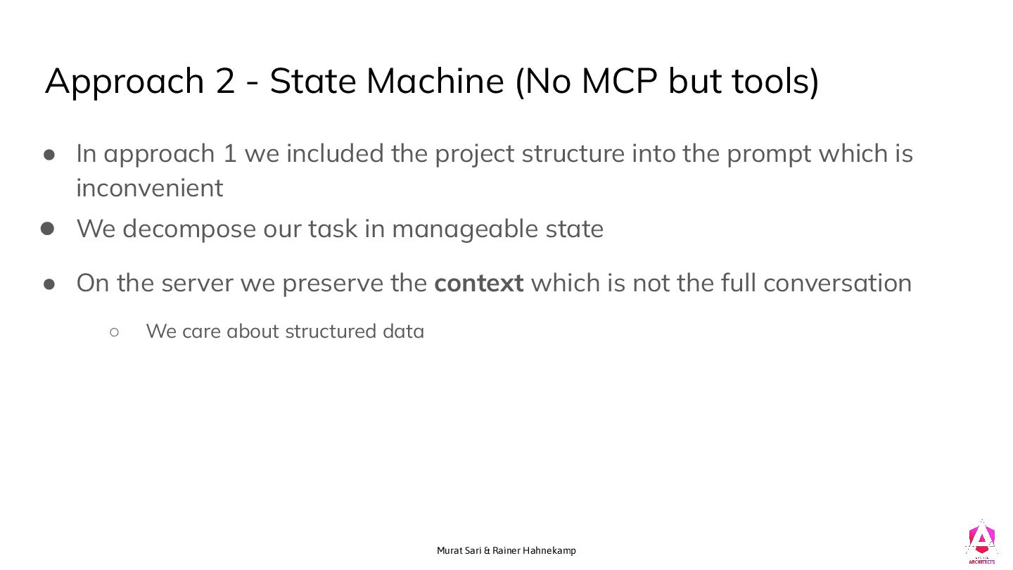(No MCP but tools) • In approach 1 we included the project structure into the prompt which is inconvenient • We decompose our task in manageable state • On the server we preserve the context which is not the full conversation ◦ We care about structured data