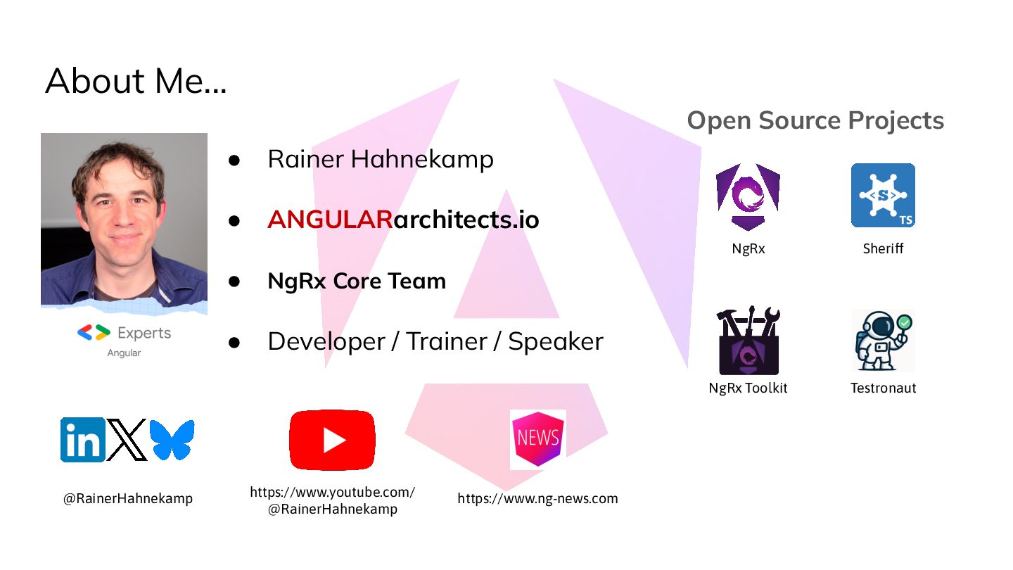 • NgRx Core Team • Developer / Trainer / Speaker @RainerHahnekamp Open Source Projects NgRx Toolkit Testronaut NgRx Sheriff
