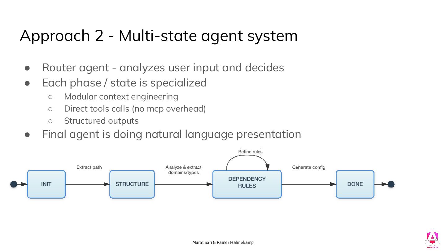 system • Router agent - analyzes user input and decides • Each phase / state is specialized ◦ Modular context engineering ◦ Direct tools calls (no mcp overhead) ◦ Structured outputs • Final agent is doing natural language presentation