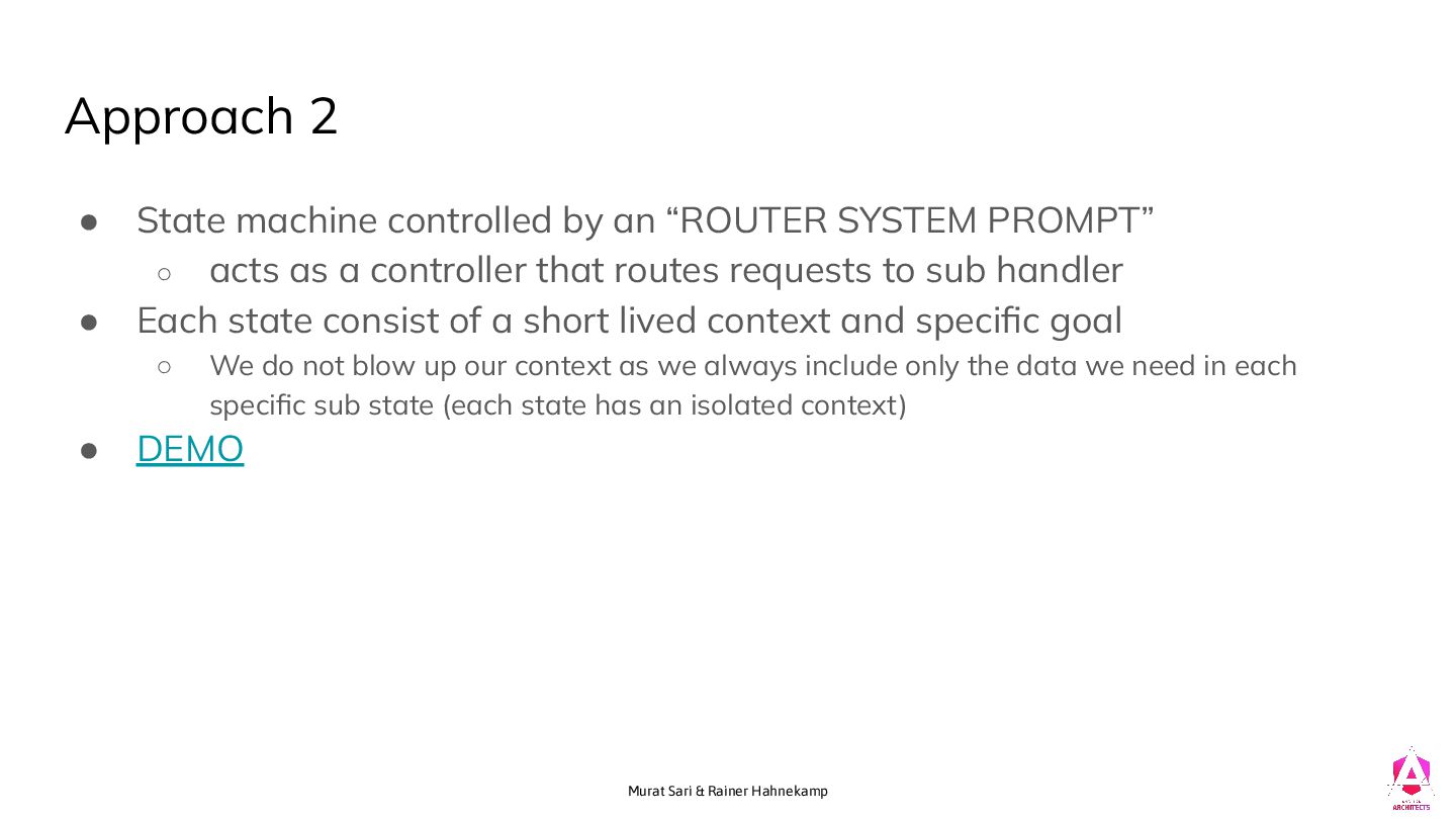 controlled by an “ROUTER SYSTEM PROMPT” ◦ acts as a controller that routes requests to sub handler • Each state consist of a short lived context and specific goal ◦ We do not blow up our context as we always include only the data we need in each specific sub state (each state has an isolated context) • DEMO