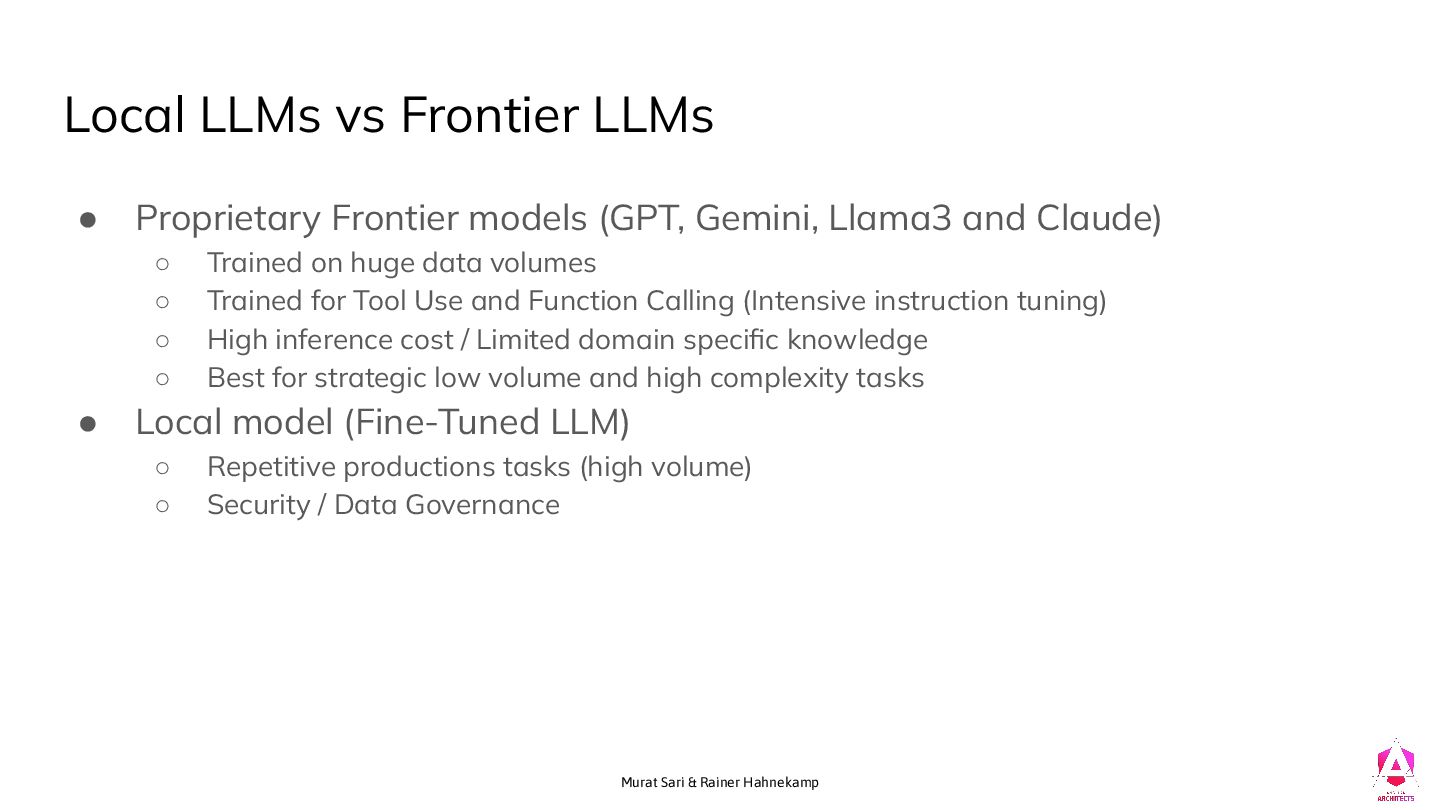 • Proprietary Frontier models (GPT, Gemini, Llama3 and Claude) ◦ Trained on huge data volumes ◦ Trained for Tool Use and Function Calling (Intensive instruction tuning) ◦ High inference cost / Limited domain specific knowledge ◦ Best for strategic low volume and high complexity tasks • Local model (Fine-Tuned LLM) ◦ Repetitive productions tasks (high volume) ◦ Security / Data Governance