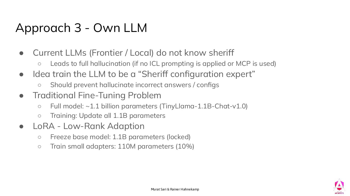 • Current LLMs (Frontier / Local) do not know sheriff ◦ Leads to full hallucination (if no ICL prompting is applied or MCP is used) • Idea train the LLM to be a “Sheriff configuration expert” ◦ Should prevent hallucinate incorrect answers / configs • Traditional Fine-Tuning Problem ◦ Full model: ~1.1 billion parameters (TinyLlama-1.1B-Chat-v1.0) ◦ Training: Update all 1.1B parameters • LoRA - Low-Rank Adaption ◦ Freeze base model: 1.1B parameters (locked) ◦ Train small adapters: 110M parameters (10%)