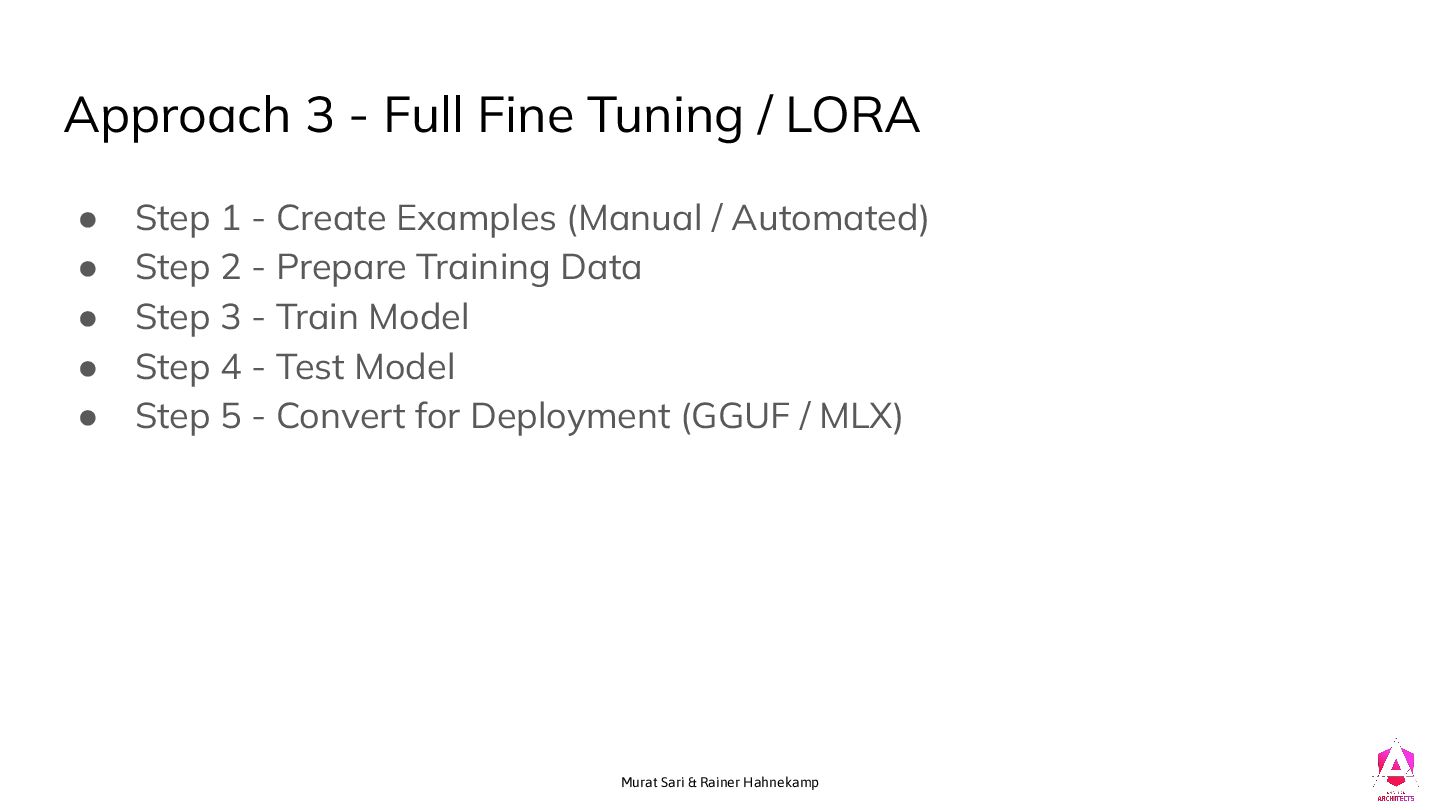 Tuning / LORA • Step 1 - Create Examples (Manual / Automated) • Step 2 - Prepare Training Data • Step 3 - Train Model • Step 4 - Test Model • Step 5 - Convert for Deployment (GGUF / MLX)