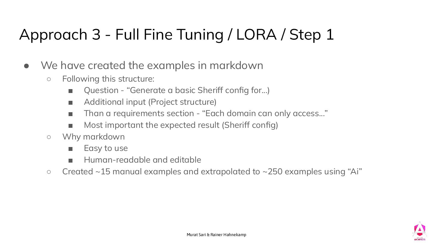 Tuning / LORA / Step 1 • We have created the examples in markdown ◦ Following this structure: ▪ Question - “Generate a basic Sheriff config for…) ▪ Additional input (Project structure) ▪ Than a requirements section - “Each domain can only access…” ▪ Most important the expected result (Sheriff config) ◦ Why markdown ▪ Easy to use ▪ Human-readable and editable ◦ Created ~15 manual examples and extrapolated to ~250 examples using “Ai”