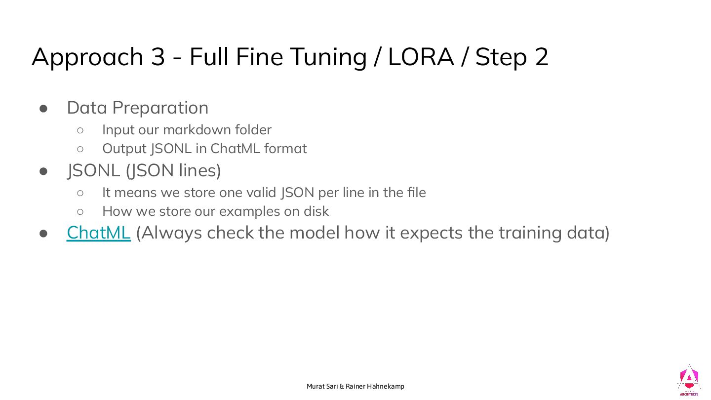 Tuning / LORA / Step 2 • Data Preparation ◦ Input our markdown folder ◦ Output JSONL in ChatML format • JSONL (JSON lines) ◦ It means we store one valid JSON per line in the file ◦ How we store our examples on disk • ChatML (Always check the model how it expects the training data)