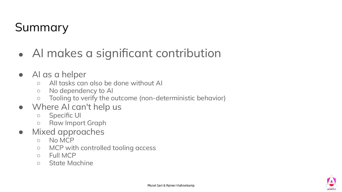 significant contribution • AI as a helper ◦ All tasks can also be done without AI ◦ No dependency to AI ◦ Tooling to verify the outcome (non-deterministic behavior) • Where AI can't help us ◦ Specific UI ◦ Raw Import Graph • Mixed approaches ◦ No MCP ◦ MCP with controlled tooling access ◦ Full MCP ◦ State Machine
