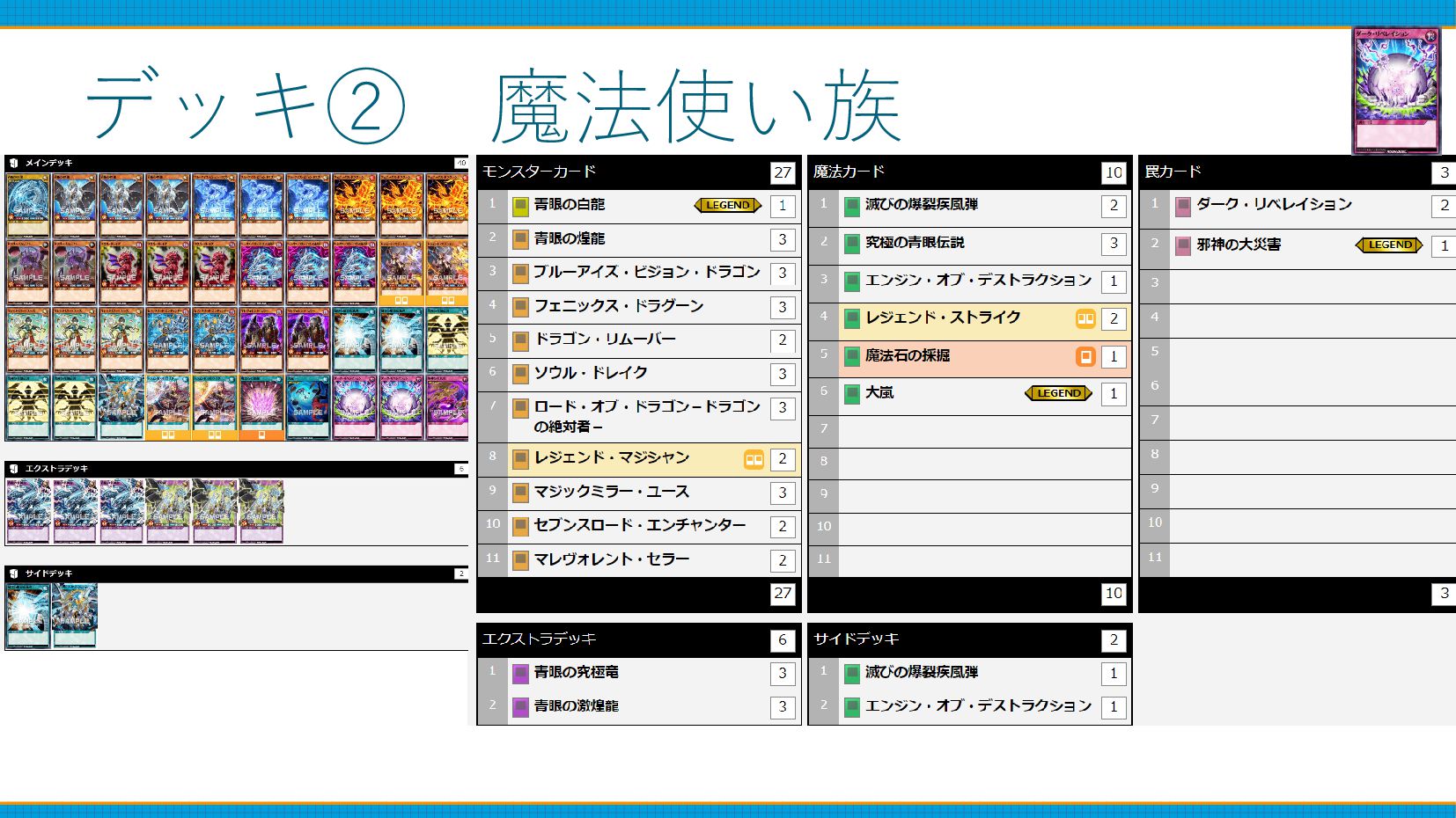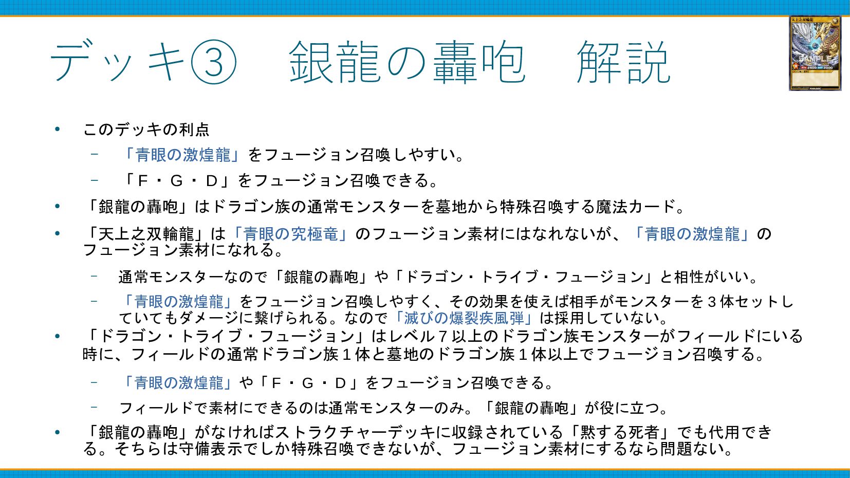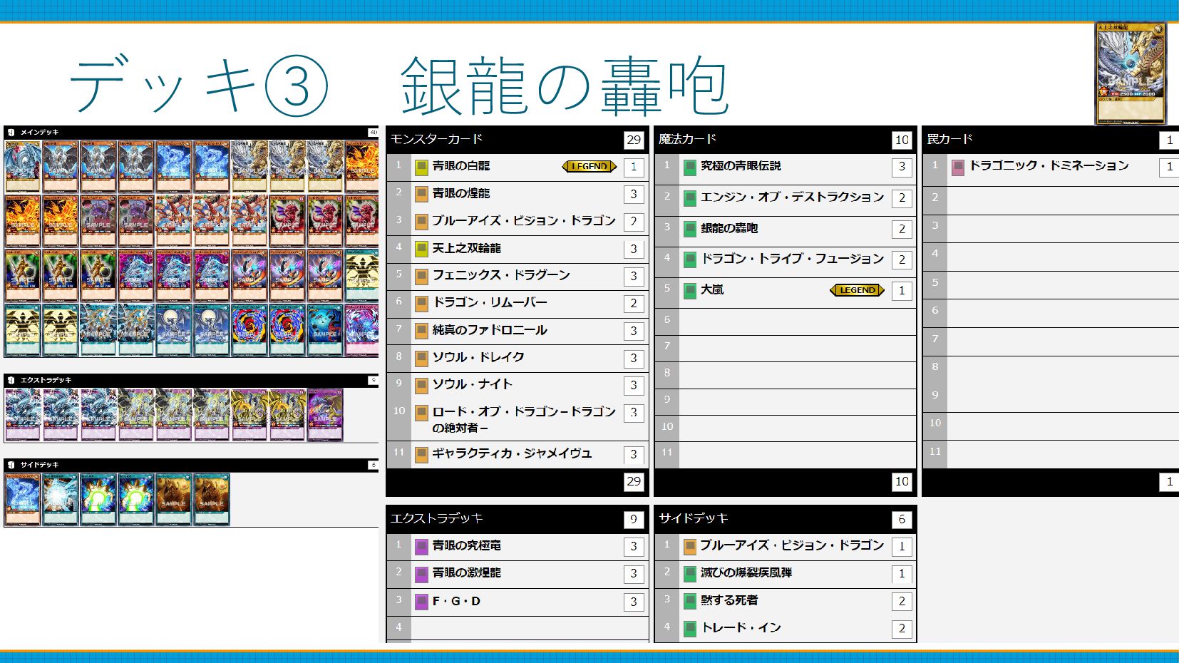 デッキ紹介 ・「青眼の白龍」+魔法使い族デッキ ・「銀龍の轟咆」採用「青眼の白龍」デッキ ・「青眼の白龍」+「プライム」デッキ
