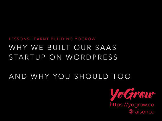 WordPress London talk from April 2016 - Elliot talks about his latest startup YoGrow.co and how feedback should drive your startup. How SaaS lets you incorporate feedback into your develop process and how WordPress is a great platform to use for your SaaS.