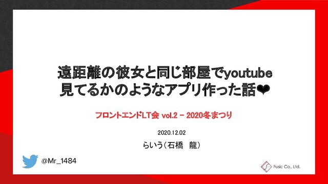 遠距離の彼女と同じ部屋でyoutube 見てるかのようなアプリ作った話❤ フロントエンドLT会 vol.2 - 2020冬まつり 2020.12.02 らいう(石橋 龍) 1 @Mr_1484