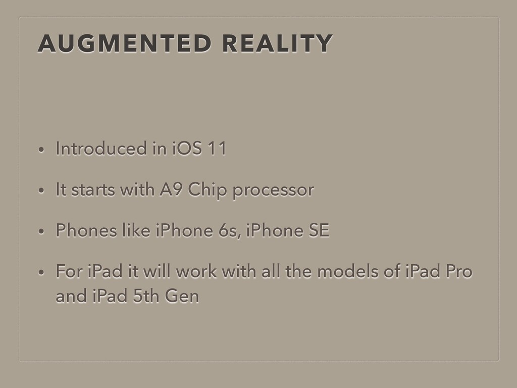 AUGMENTED REALITY • Introduced in iOS 11 • It starts