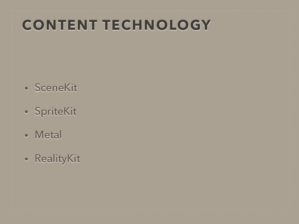 CONTENT TECHNOLOGY • SceneKit • SpriteKit • Metal • RealityKit