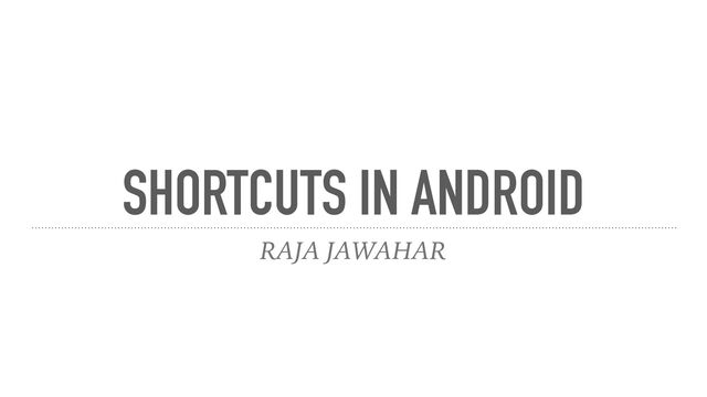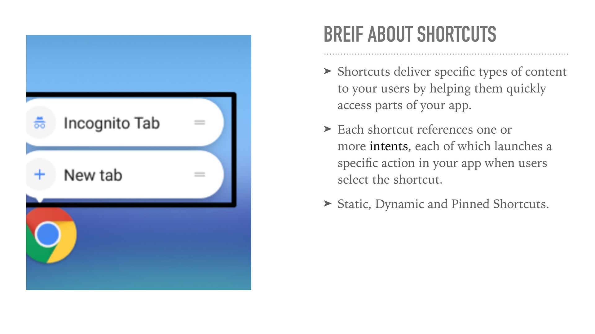 of content to your users by helping them quickly access parts of your app. ➤ Each shortcut references one or more intents, each of which launches a speci fi c action in your app when users select the shortcut. ➤ Static, Dynamic and Pinned Shortcuts.