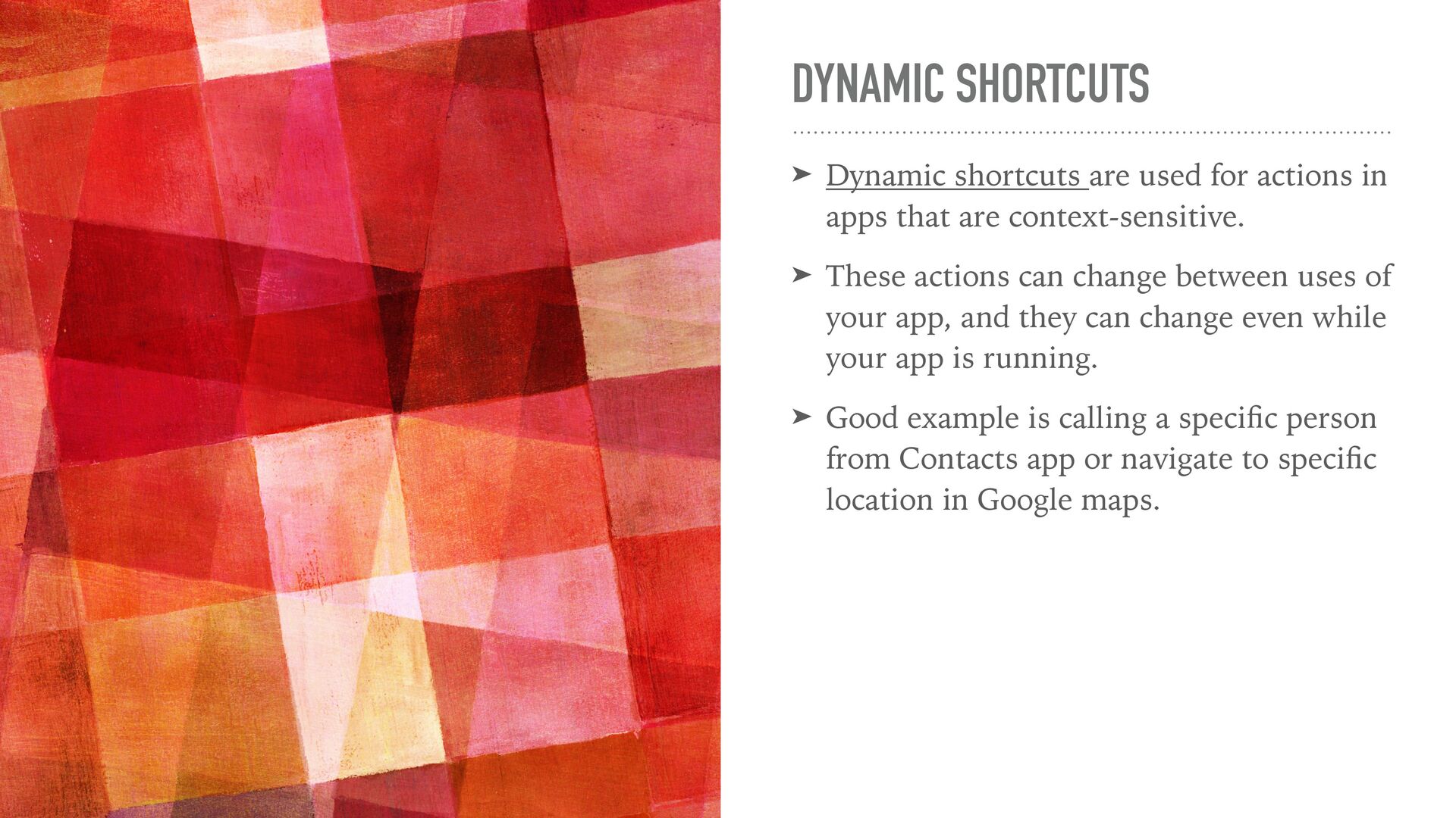 apps that are context-sensitive. ➤ These actions can change between uses of your app, and they can change even while your app is running. ➤ Good example is calling a speci fi c person from Contacts app or navigate to speci fi c location in Google maps.