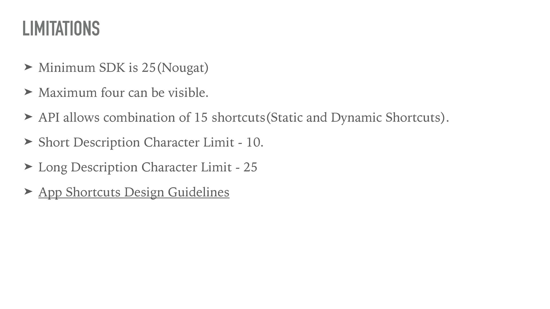 visible. ➤ API allows combination of 15 shortcuts(Static and Dynamic Shortcuts). ➤ Short Description Character Limit - 10. ➤ Long Description Character Limit - 25 ➤ App Shortcuts Design Guidelines LIMITATIONS