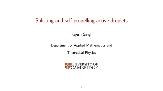 is a generic consequence of an e ff ective interfacial tension - mechanical (causing fl ow) or di ff usive (causing Ostwald ripening) - becoming negative. SSI Ostwald ripening spontaneous symmetry breaking on the surface of active droplets => surface slip fl ow => exterior fl uid fl ow. The resulting fl uid stress causes force-free self-propulsion. This provides a new method to simulate many droplets 1. Splitting active droplets 2. Self-propelling active droplets Summary: splitting and self-propelling droplets