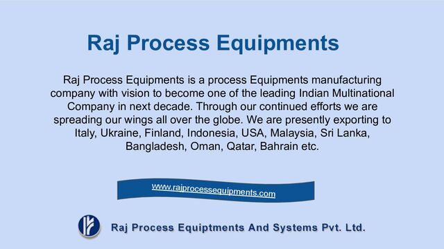 with vision to become one of the leading Indian Multinational Company in next decade. Through our continued efforts we are spreading our wings all over the globe. We are presently exporting to Italy, Ukraine, Finland, Indonesia, USA, Malaysia, Sri Lanka, Bangladesh, Oman, Qatar, Bahrain etc. Raj Process Equipments