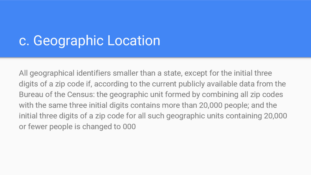 except for the initial three digits of a zip code if, according to the current publicly available data from the Bureau of the Census: the geographic unit formed by combining all zip codes with the same three initial digits contains more than 20,000 people; and the initial three digits of a zip code for all such geographic units containing 20,000 or fewer people is changed to 000