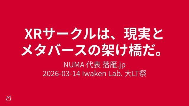 XRサークルは、現実と メタバースの架け橋だ。 NUMA 代表 落雁.jp 2026-03-14 Iwaken Lab. ⼤LT祭