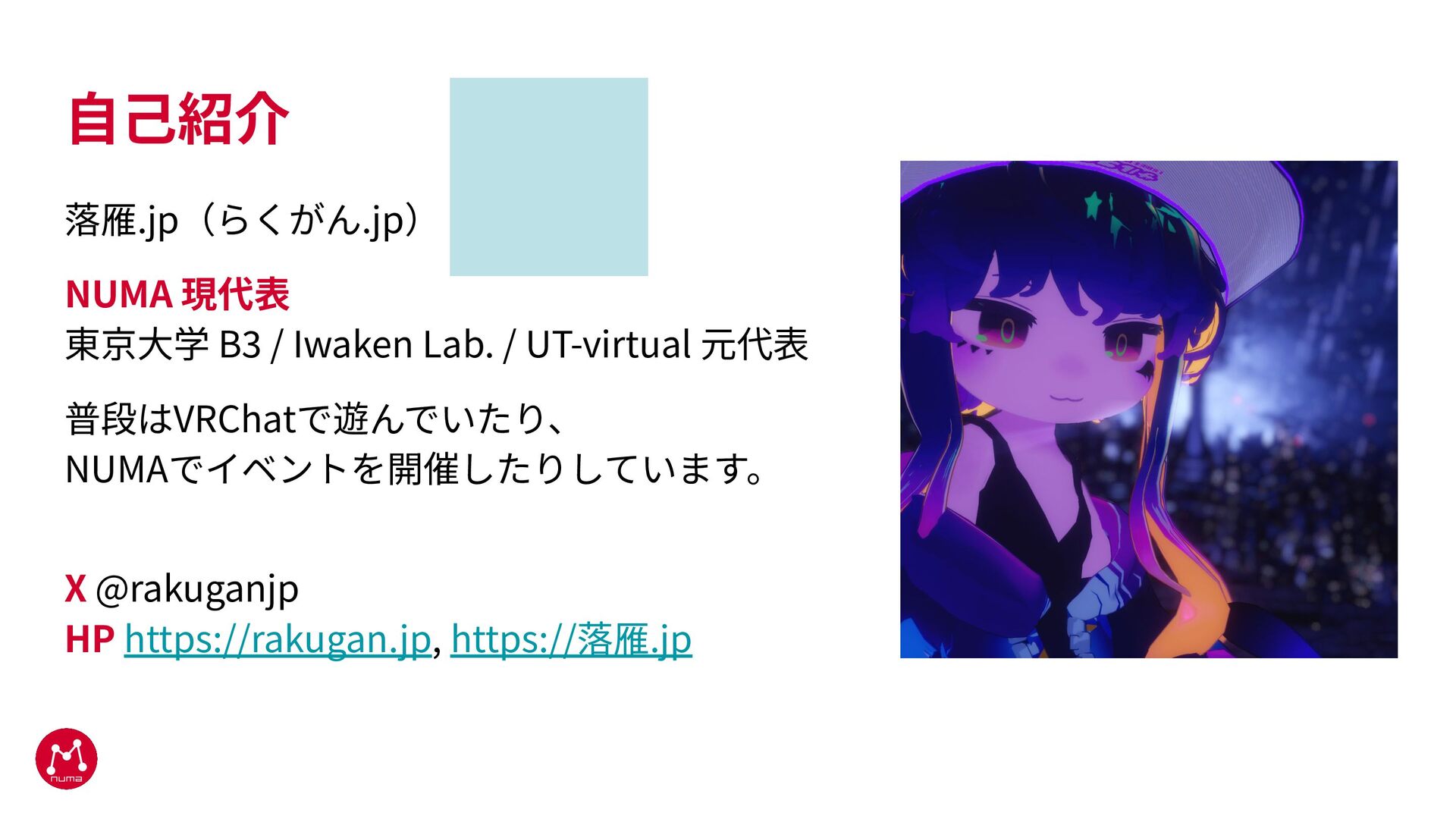 UT-virtual 元代表 普段はVRChatで遊んでいたり、 NUMAでイベントを開催したりしています。 X @rakuganjp HP https://rakugan.jp, https://落雁.jp