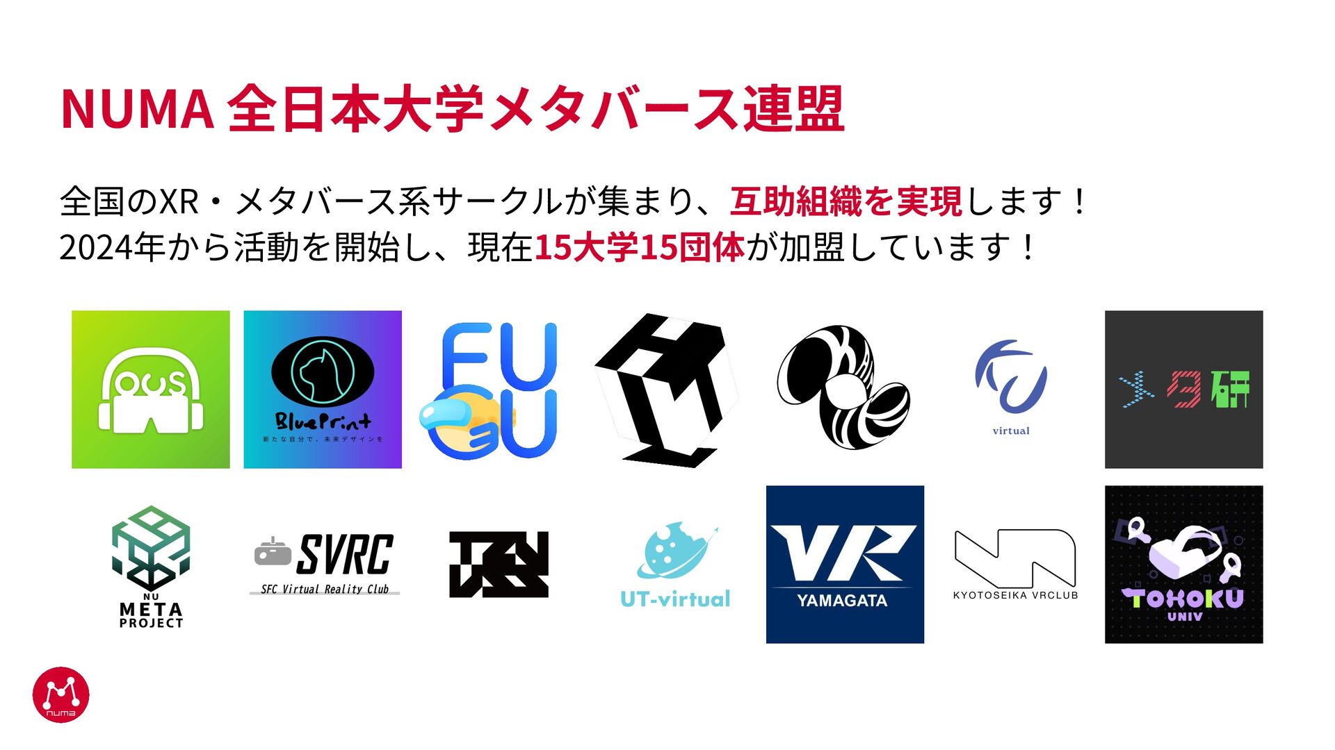 NUMA 全⽇本⼤学メタバース連盟 全国のXR‧メタバース系サークルが集まり、互助組織を実現します! 2024年から活動を開始し、現在15⼤学15団体が加盟しています!