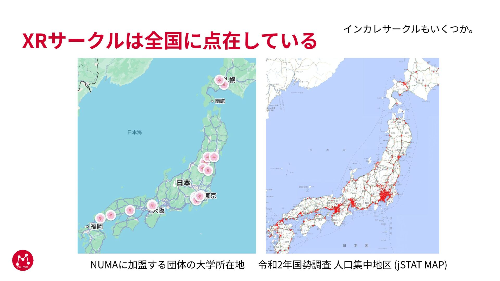 XRサークルは全国に点在している NUMAに加盟する団体の⼤学所在地 令和2年国勢調査 ⼈⼝集中地区 (jSTAT MAP) インカレサークルもいくつか。
