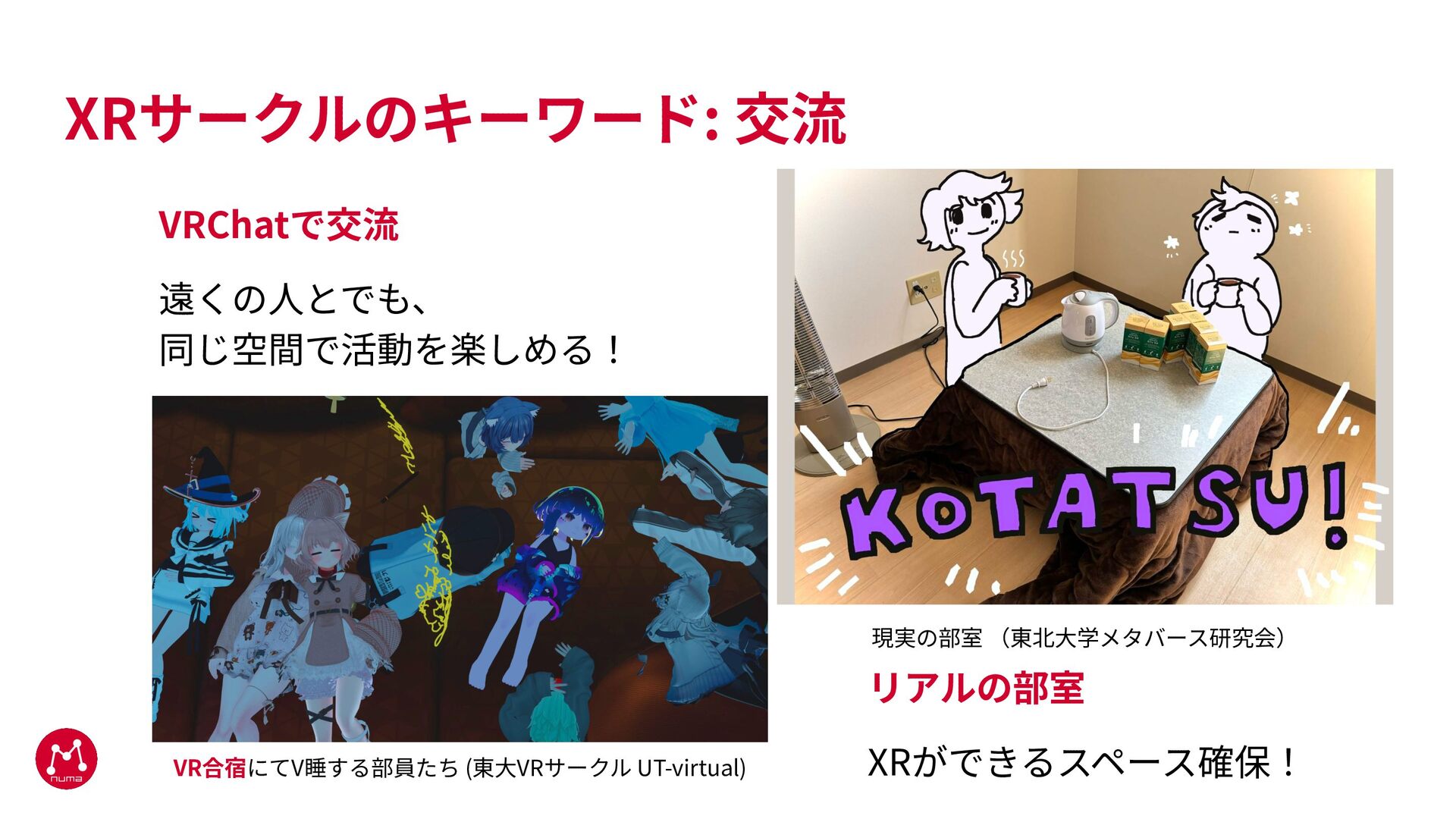 XRサークルのキーワード: 交流 VRChatで交流 遠くの⼈とでも、 同じ空間で活動を楽しめる! VR合宿にてV睡する部員たち (東⼤VRサークル UT-virtual) 現実の部室 (東北⼤学メタバース研究会)