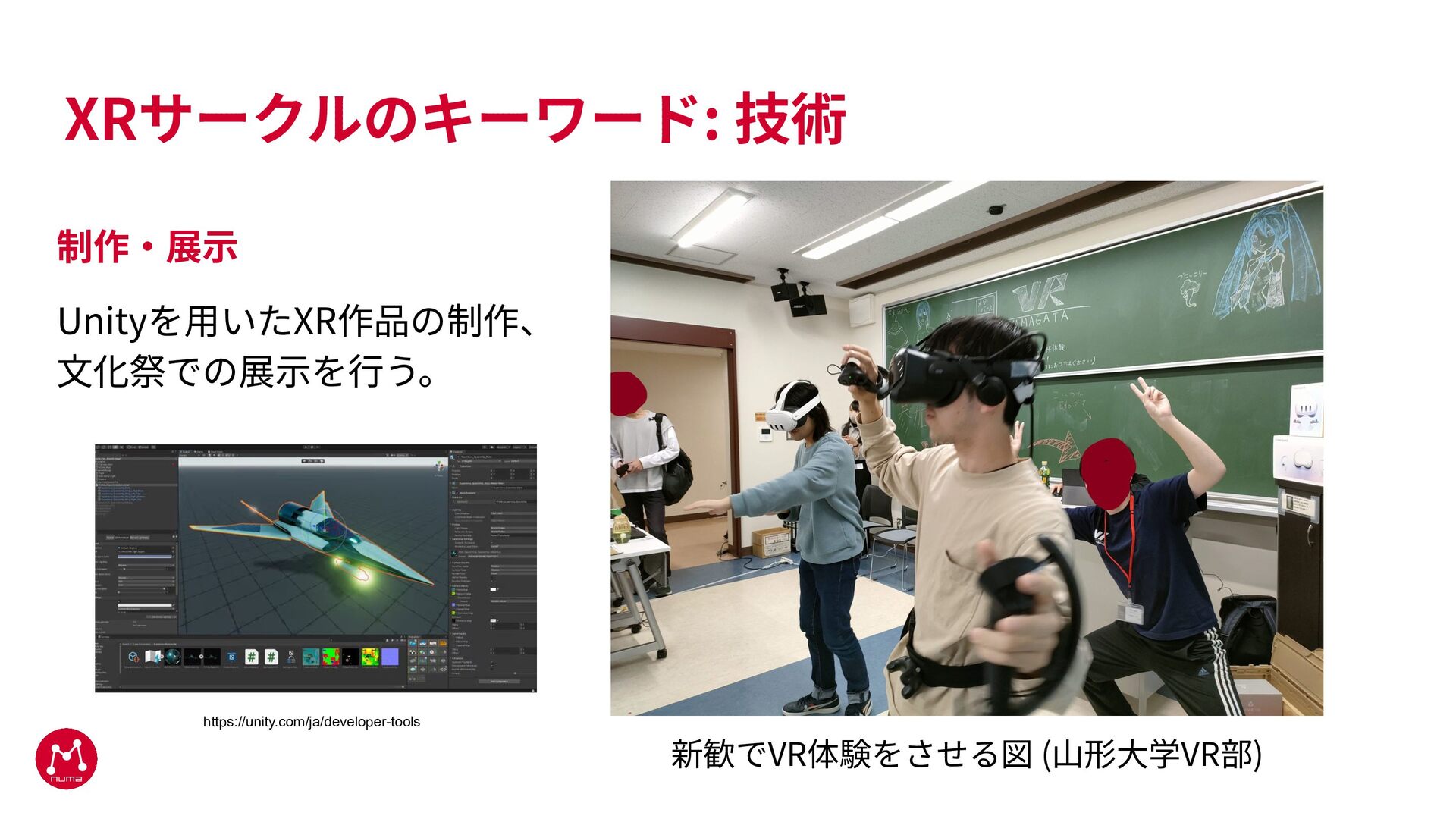 XRサークルのキーワード: 技術 制作‧展⽰ Unityを⽤いたXR作品の制作、 ⽂化祭での展⽰を⾏う。 新歓でVR体験をさせる図 (⼭形⼤学VR部) https://unity.com/ja/developer-tools