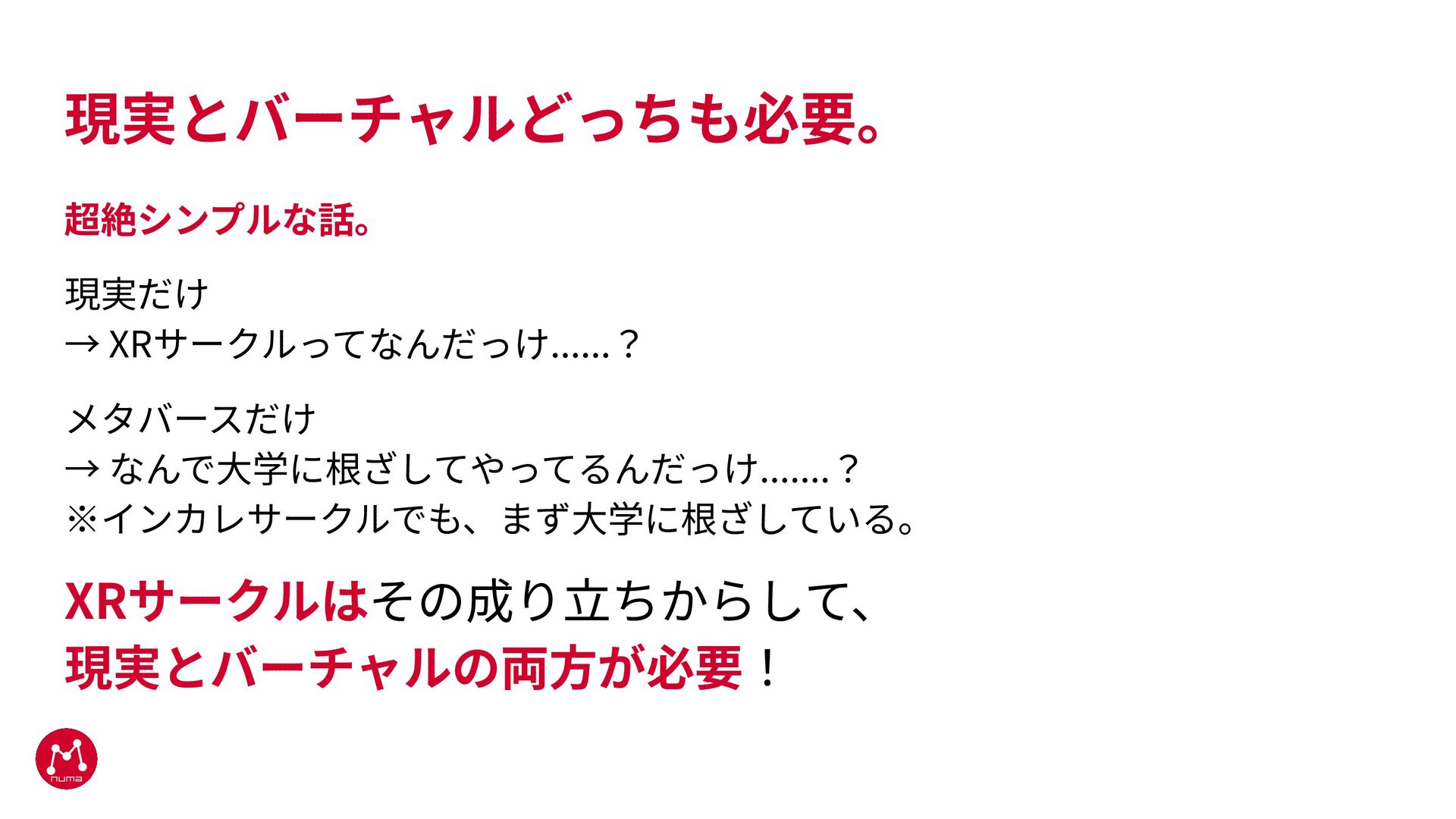 現実とバーチャルどっちも必要。 超絶シンプルな話。 現実だけ → XRサークルってなんだっけ......? メタバースだけ → なんで⼤学に根ざしてやってるんだっけ.......? ※インカレサークルでも、まず⼤学に根ざしている。 XRサークルはその成り⽴ちからして、