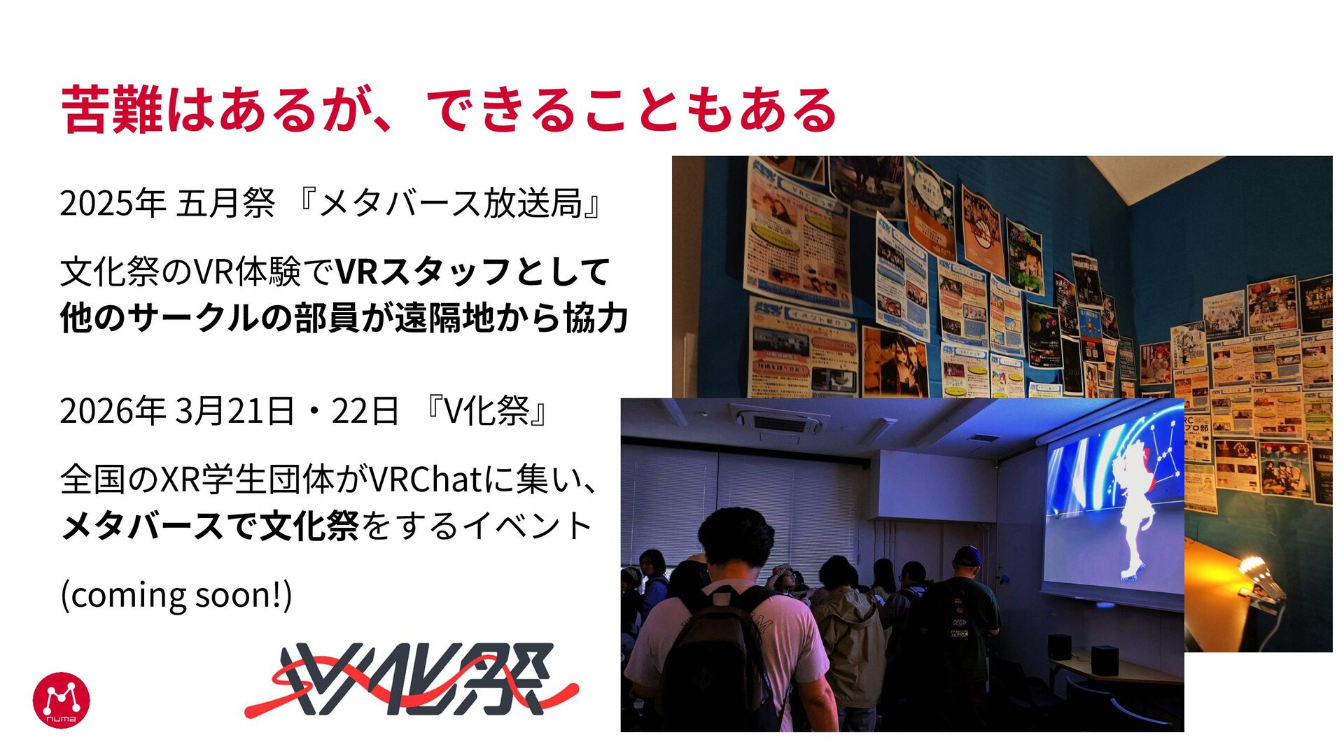 苦難はあるが、できることもある 2025年 五⽉祭 『メタバース放送局』 ⽂化祭のVR体験でVRスタッフとして 他のサークルの部員が遠隔地から協⼒ 2026年 3⽉21⽇‧22⽇ 『V化祭』 全国のXR学⽣団体がVRChatに集い、
