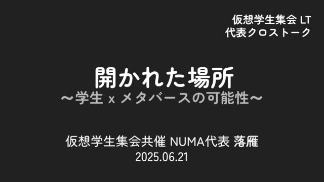 開かれた場所 仮想学生集会共催 NUMA代表 落雁 2025.06.21 ~学生 x メタバースの可能性~ 仮想学生集会 LT