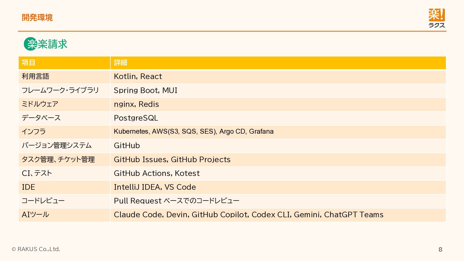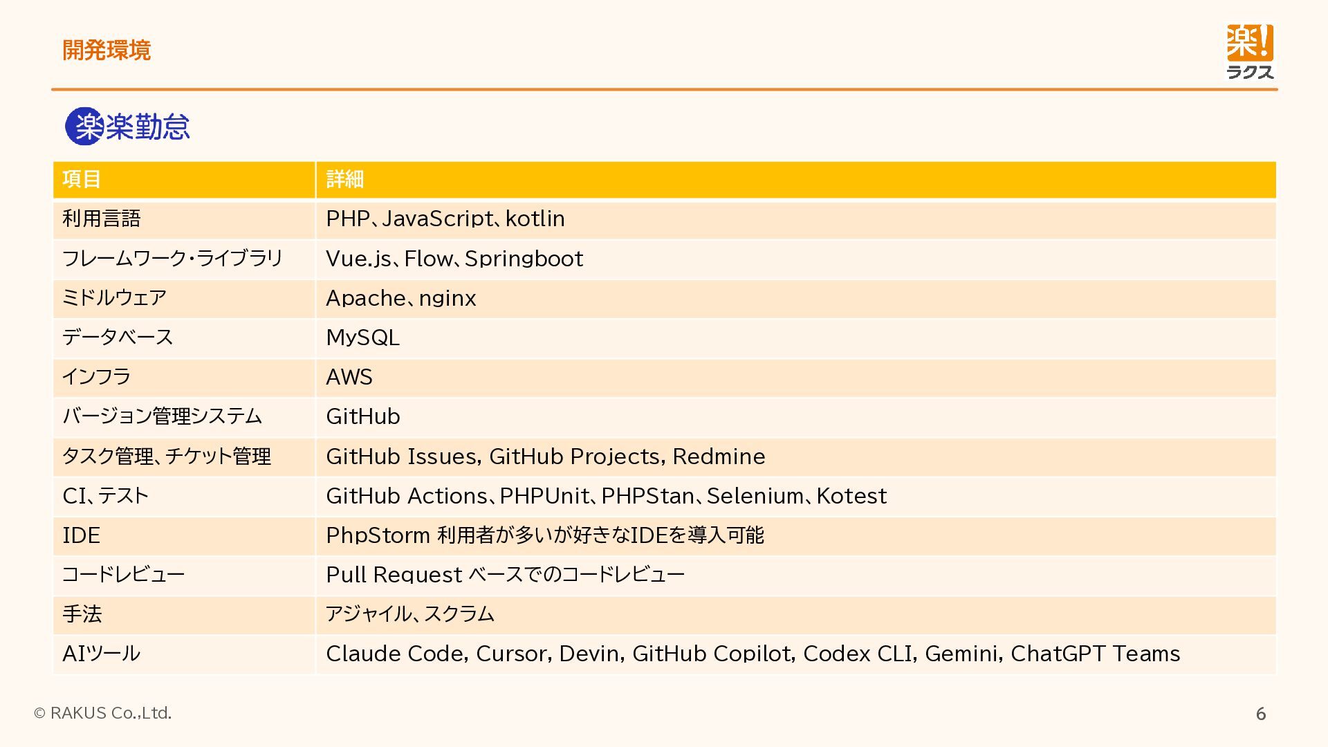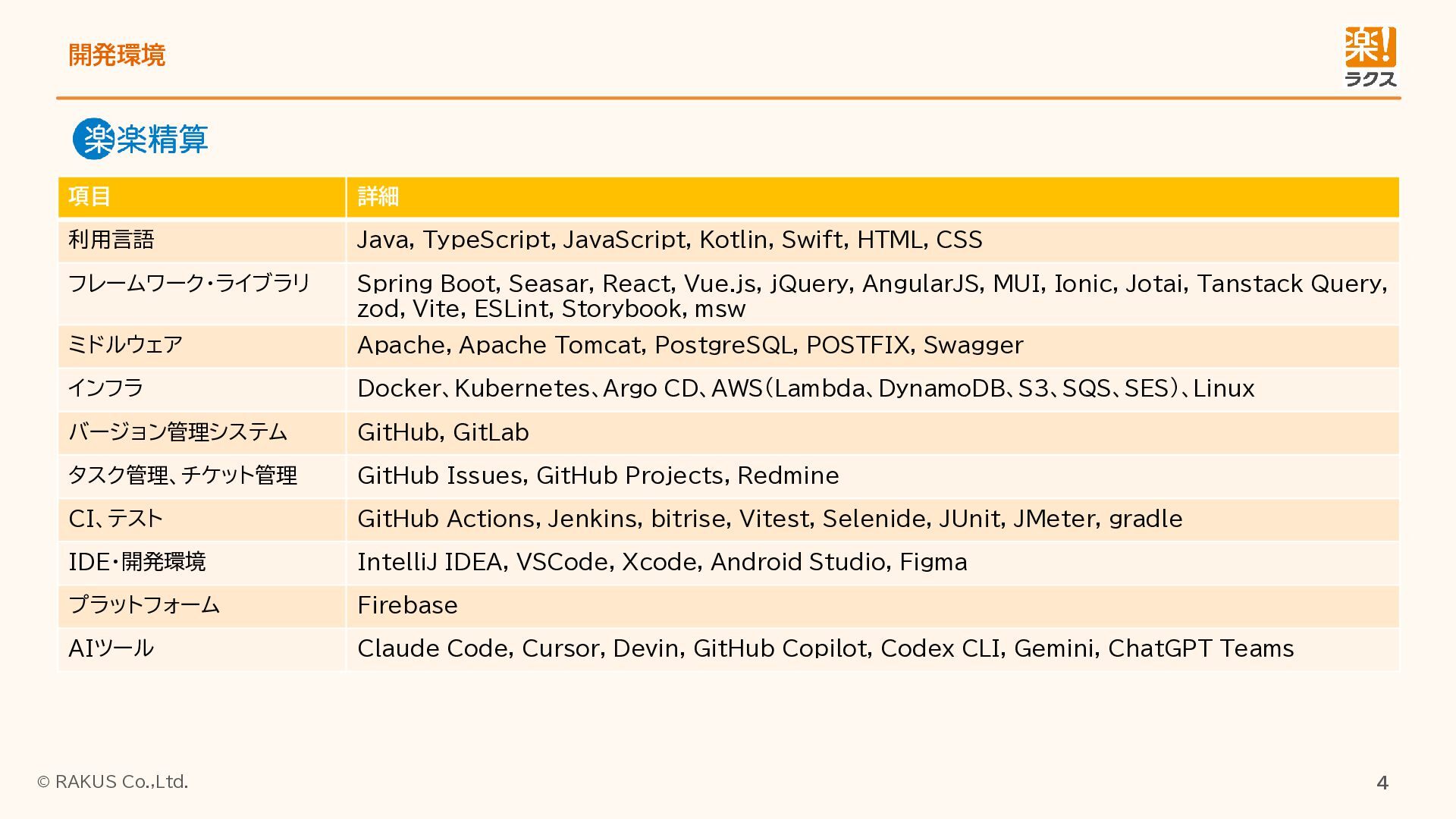 JavaScript, Kotlin, Swift, HTML, CSS フレームワーク・ライブラリ Spring Boot, Seasar, React, Vue.js, jQuery, AngularJS, MUI, Ionic, Jotai, Tanstack Query, zod, Vite, ESLint, Storybook, msw ミドルウェア Apache, Apache Tomcat, PostgreSQL, POSTFIX, Swagger インフラ Docker、Kubernetes、Argo CD、AWS(Lambda、DynamoDB、S3、SQS、SES)、Linux バージョン管理システム GitHub, GitLab タスク管理、チケット管理 GitHub Issues, GitHub Projects, Redmine CI、テスト GitHub Actions, Jenkins, bitrise, Vitest, Selenide, JUnit, JMeter, gradle IDE・開発環境 IntelliJ IDEA, VSCode, Xcode, Android Studio, Figma プラットフォーム Firebase AIツール Claude Code, Cursor, Devin, GitHub Copilot, Codex CLI, Gemini, ChatGPT Teams