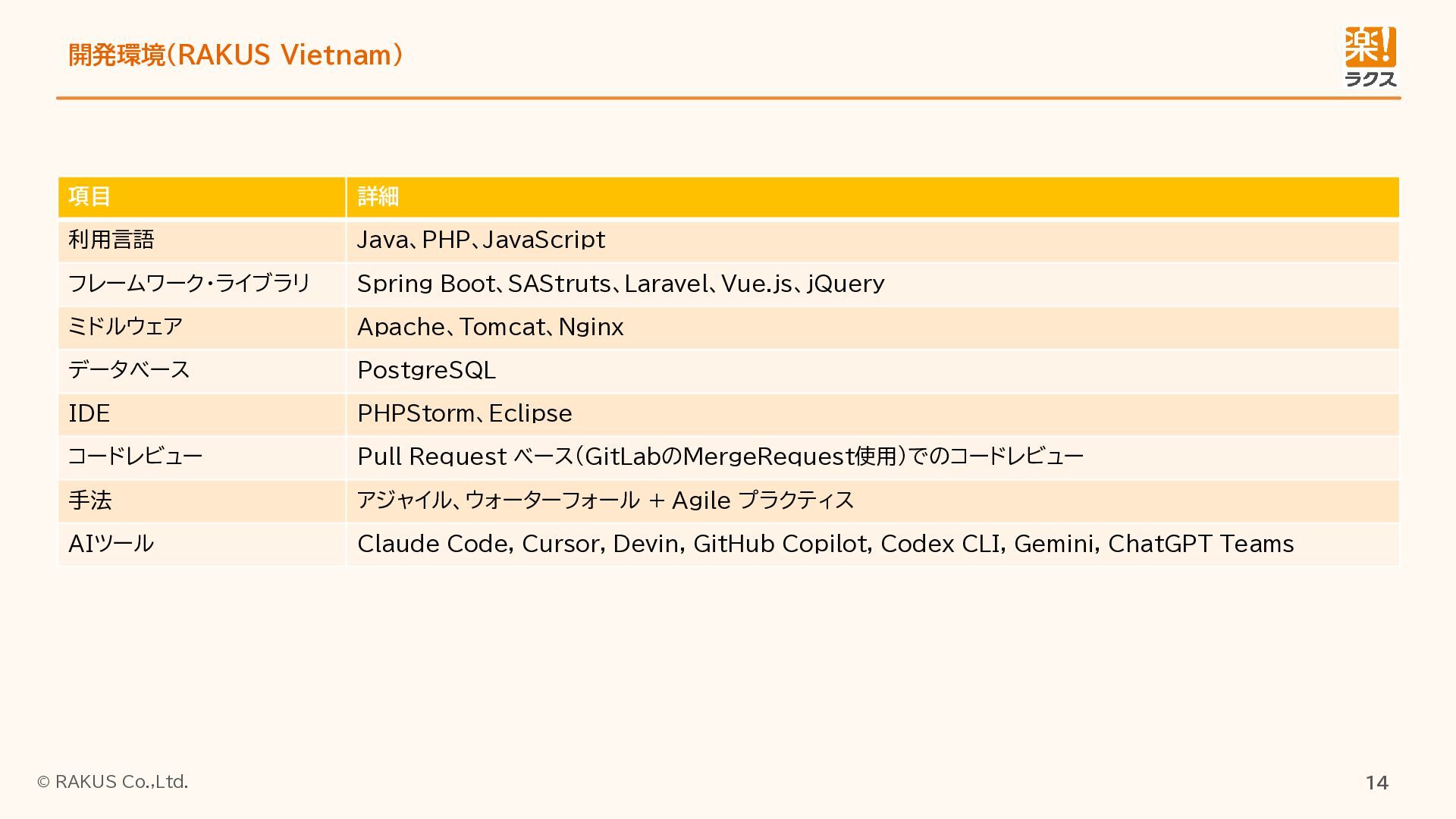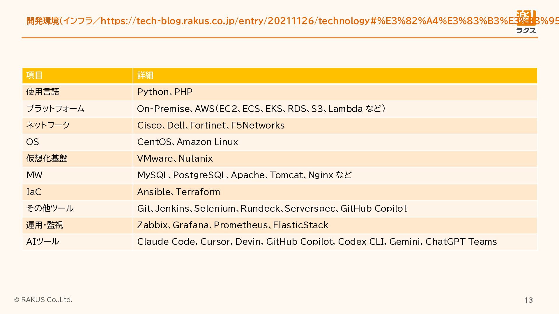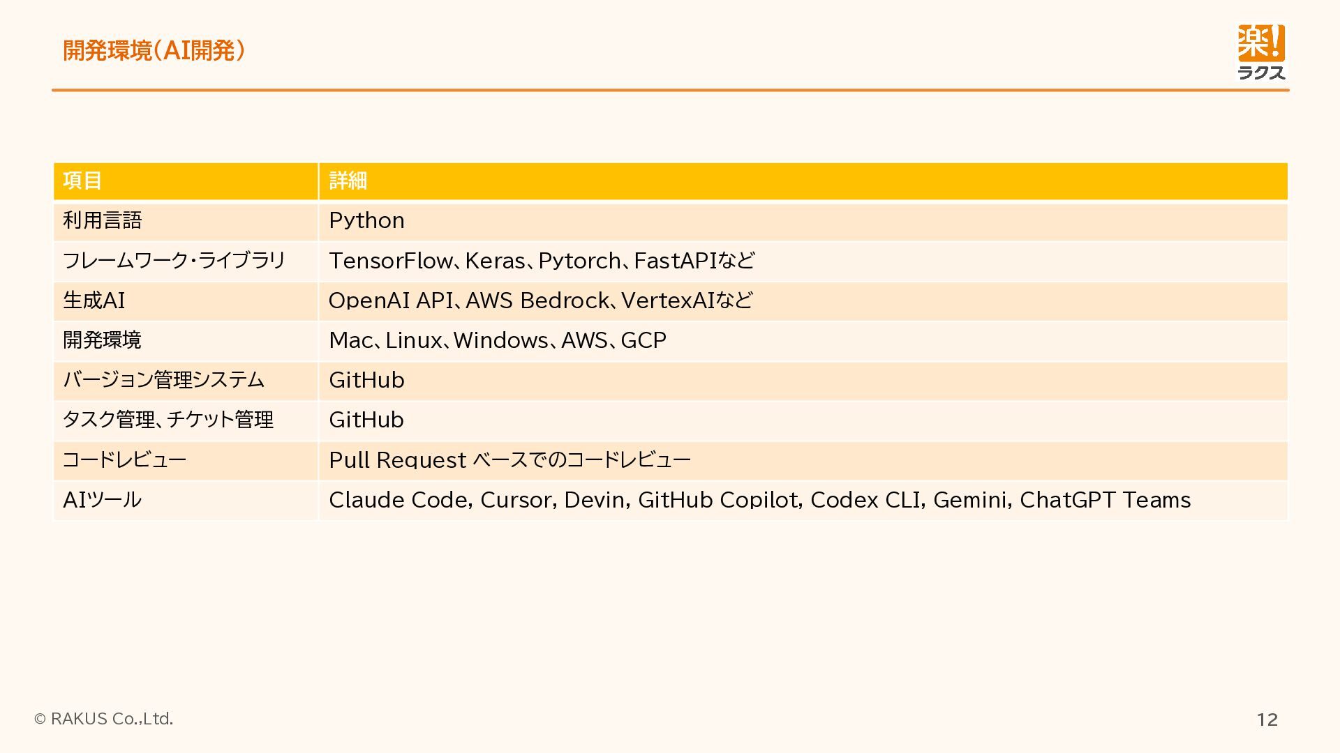 JavaScript, Kotlin, Swift, HTML, CSS フレームワーク・ライブラリ Spring Boot, Seasar, React, Vue.js, jQuery, AngularJS, MUI, Ionic, Jotai, Tanstack Query, zod, Vite, ESLint, Storybook, msw ミドルウェア Apache, Apache Tomcat, PostgreSQL, POSTFIX, Swagger インフラ Docker、Kubernetes、Argo CD、AWS(Lambda、DynamoDB、S3、SQS、SES)、Linux バージョン管理システム GitHub, GitLab タスク管理、チケット管理 GitHub Issues, GitHub Projects, Redmine CI、テスト GitHub Actions, Jenkins, bitrise, Vitest, Selenide, JUnit, JMeter, gradle IDE・開発環境 IntelliJ IDEA, VSCode, Xcode, Android Studio, Figma プラットフォーム Firebase AIツール Claude Code, Cursor, Devin, GitHub Copilot, Codex CLI, Gemini, ChatGPT Teams