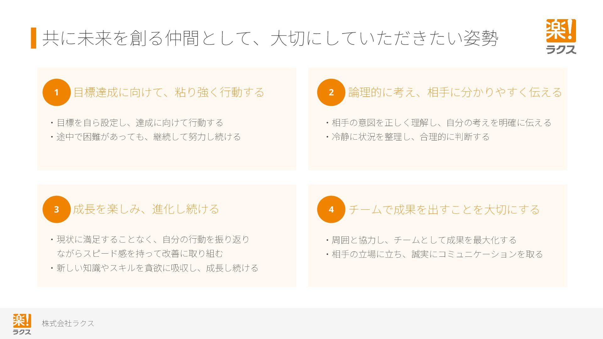 株式会社ラクス 共に未来を創る仲間として、大切にしていただきたい姿勢 目標達成に向けて、粘り強く行動する ・目標を自ら設定し、達成に向けて行動する ・途中で困難があっても、継続して努力し続ける 成長を楽しみ、進化し続ける ・現状に満足することなく、自分の行動を振り返り ながらスピード感を持って改善に取り組む ・新しい知識やスキルを貪欲に吸収し、成長し続ける 論理的に考え、相手に分かりやすく伝える