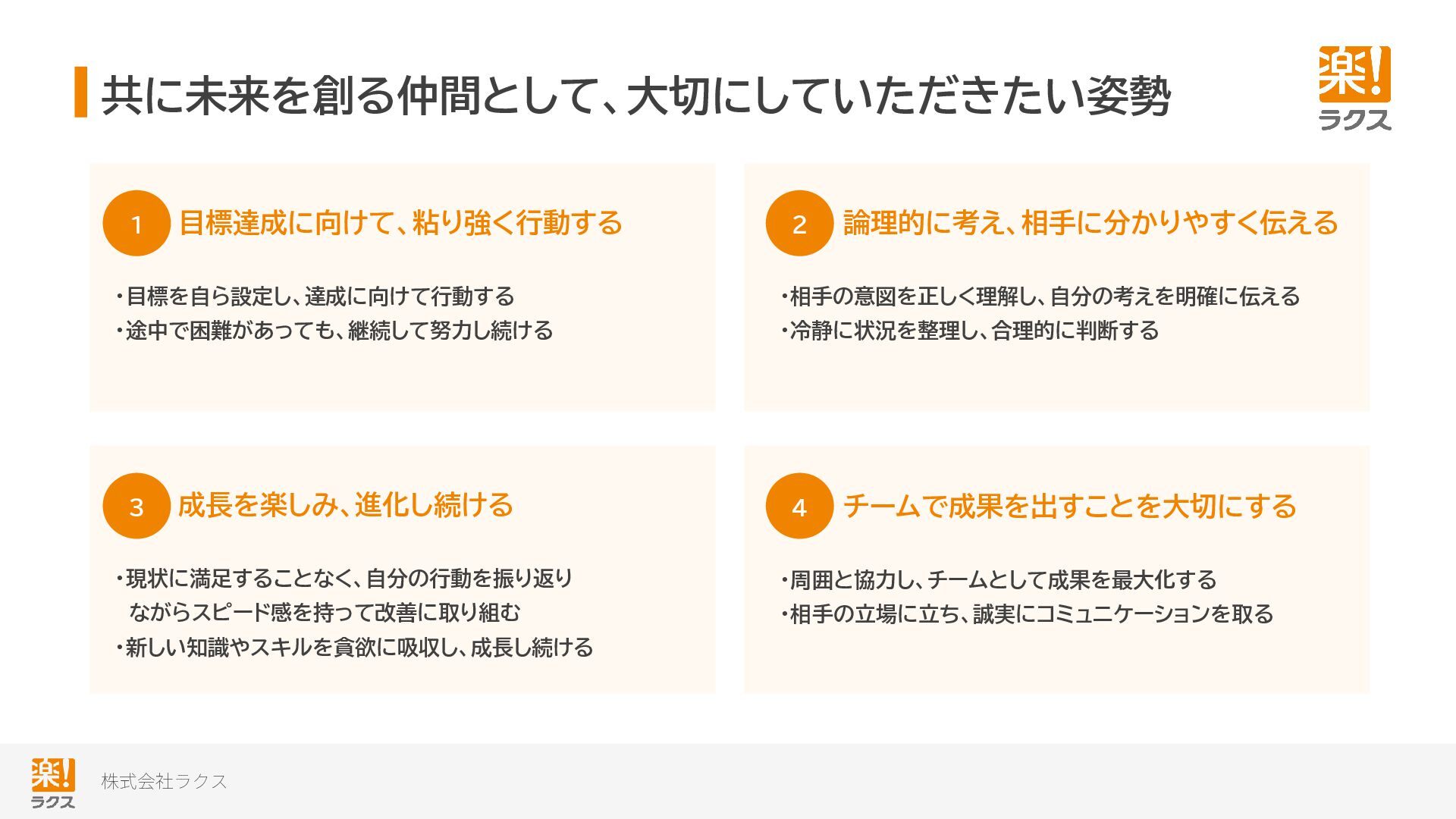 株式会社ラクス 共に未来を創る仲間として、大切にしていただきたい姿勢 目標達成に向けて、粘り強く行動する ・目標を自ら設定し、達成に向けて行動する ・途中で困難があっても、継続して努力し続ける 成長を楽しみ、進化し続ける ・現状に満足することなく、自分の行動を振り返り ながらスピード感を持って改善に取り組む ・新しい知識やスキルを貪欲に吸収し、成長し続ける 論理的に考え、相手に分かりやすく伝える