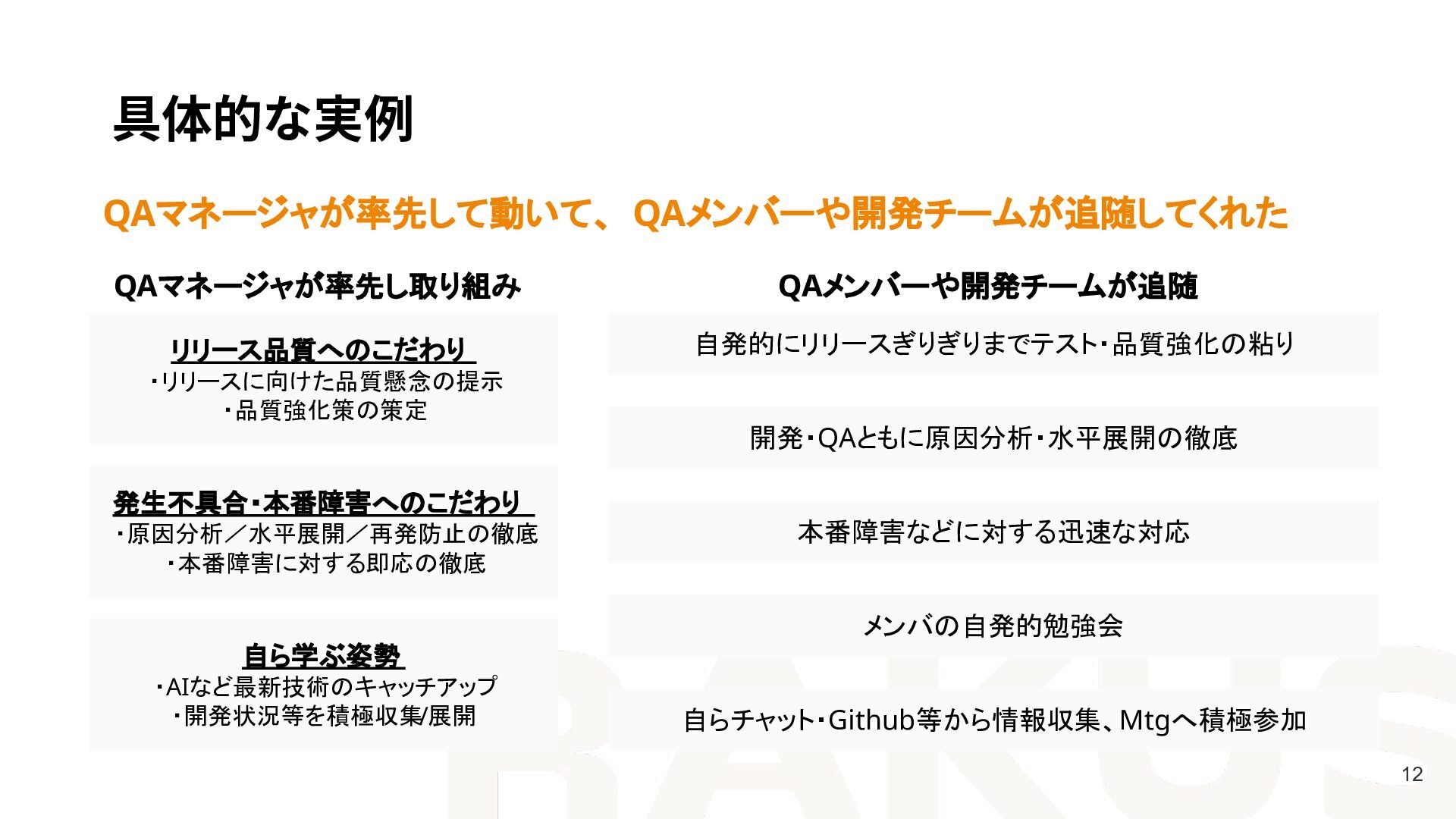 ・原因分析/水平展開/再発防止の徹底 ・本番障害に対する即応の徹底 自ら学ぶ姿勢 ・AIなど最新技術のキャッチアップ ・開発状況等を積極収集/展開 メンバの自発的勉強会 自らチャット・Github等から情報収集、Mtgへ積極参加 本番障害などに対する迅速な対応 開発・QAともに原因分析・水平展開の徹底 自発的にリリースぎりぎりまでテスト・品質強化の粘り