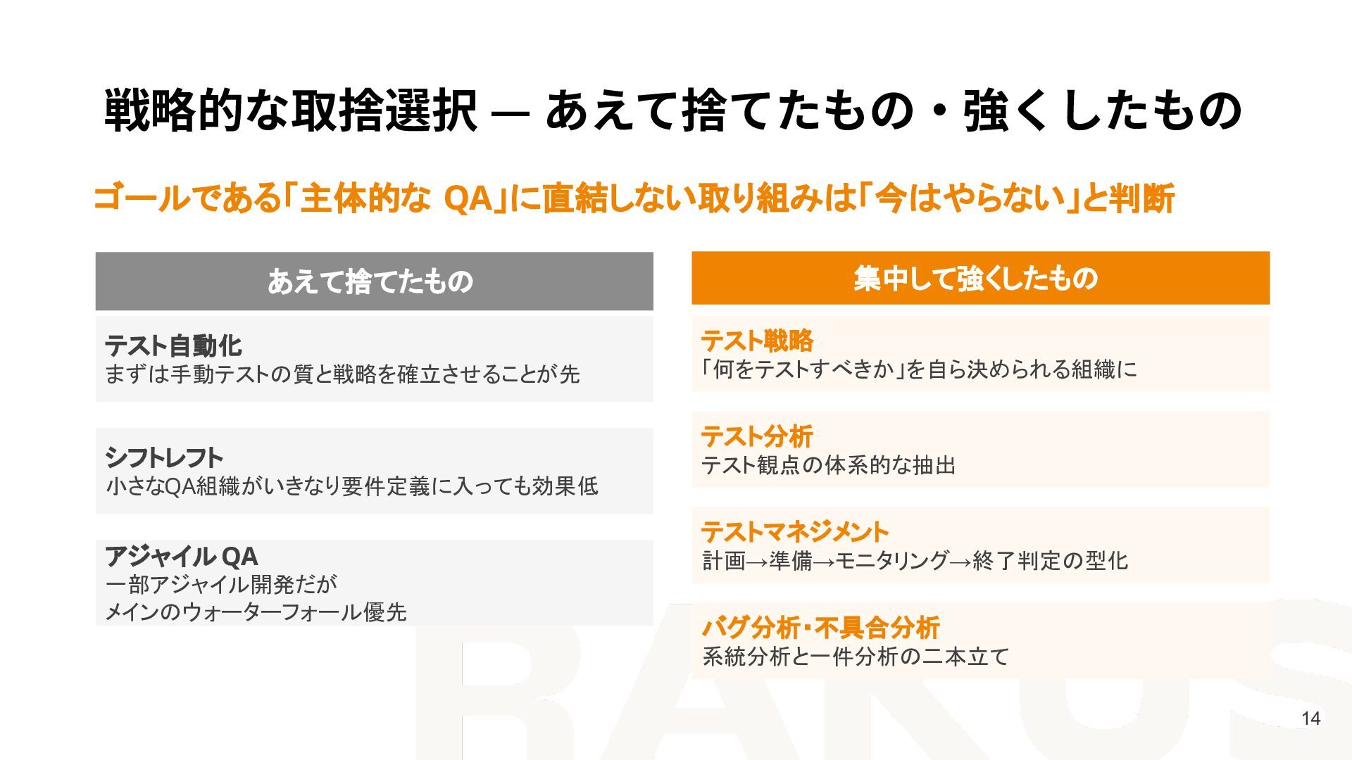 小さなQA組織がいきなり要件定義に入っても効果低 アジャイル QA 一部アジャイル開発だが メインのウォーターフォール優先 集中して強くしたもの テスト戦略 「何をテストすべきか」を自ら決められる組織に テスト分析 テスト観点の体系的な抽出 テストマネジメント 計画→準備→モニタリング→終了判定の型化 バグ分析・不具合分析 系統分析と一件分析の二本立て