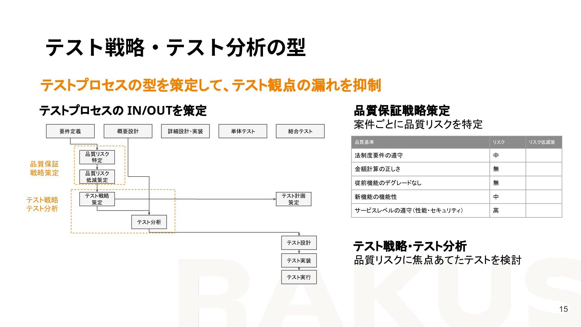 テスト計画 策定 要件定義 概要設計 詳細設計・実装 単体テスト 結合テスト テスト設計 テスト実装 テスト実行 品質保証 戦略策定 テスト戦略 テスト分析 品質基準 リスク リスク低減策 法制度要件の遵守 中 金額計算の正しさ 無 従前機能のデグレードなし 無 新機能の機能性 中 サービスレベルの遵守(性能・セキュリティ) 高 テスト戦略・テスト分析 品質リスクに焦点あてたテストを検討 品質保証戦略策定 案件ごとに品質リスクを特定 テストプロセスの IN/OUTを策定
