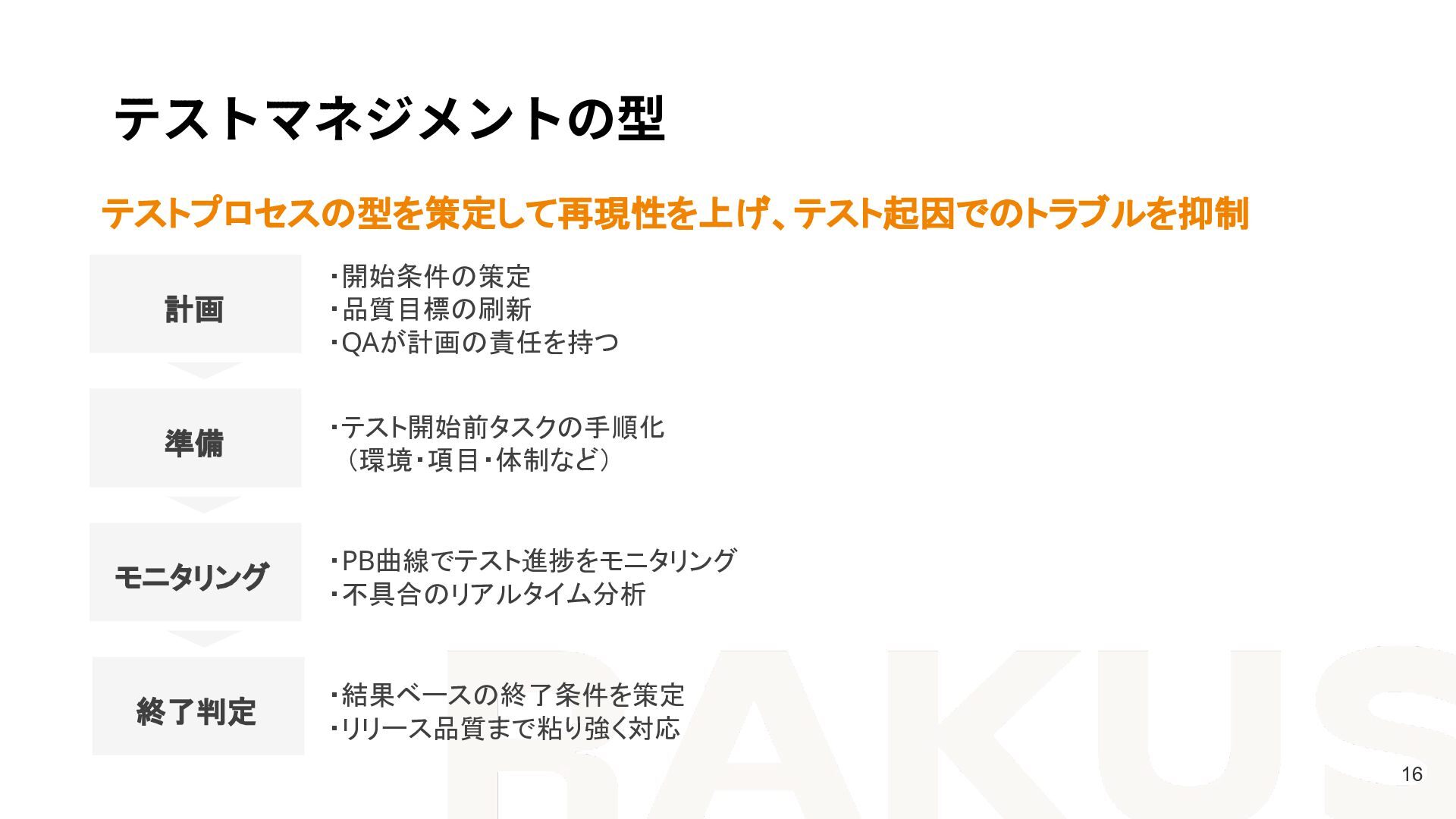 ・テスト開始前タスクの手順化  (環境・項目・体制など) ・PB曲線でテスト進捗をモニタリング ・不具合のリアルタイム分析 ・結果ベースの終了条件を策定 ・リリース品質まで粘り強く対応