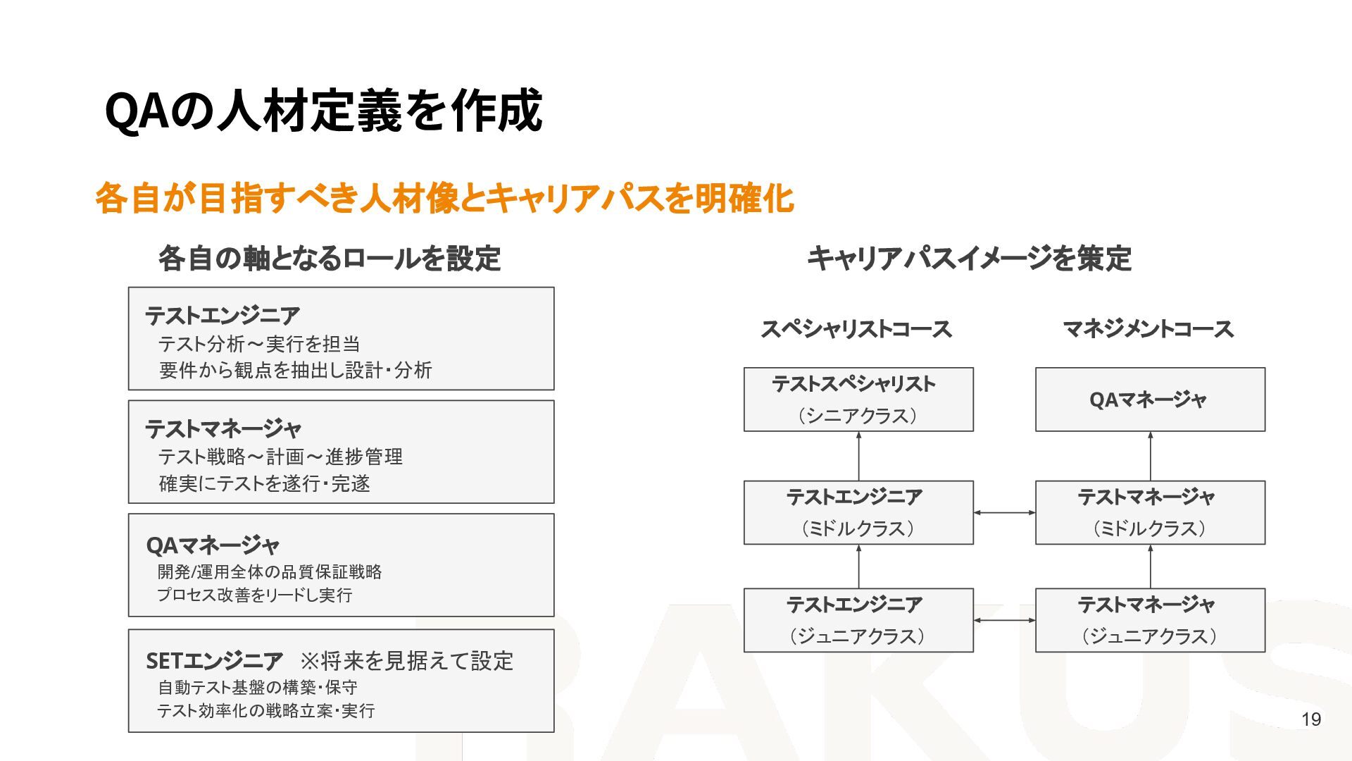 自動テスト基盤の構築・保守  テスト効率化の戦略立案・実行 QAマネージャ  開発/運用全体の品質保証戦略  プロセス改善をリードし実行 各自の軸となるロールを設定 キャリアパスイメージを策定 テストエンジニア (ジュニアクラス) テストマネージャ (ジュニアクラス) テストマネージャ (ミドルクラス) QAマネージャ テストエンジニア (ミドルクラス) テストスペシャリスト (シニアクラス) スペシャリストコース マネジメントコース
