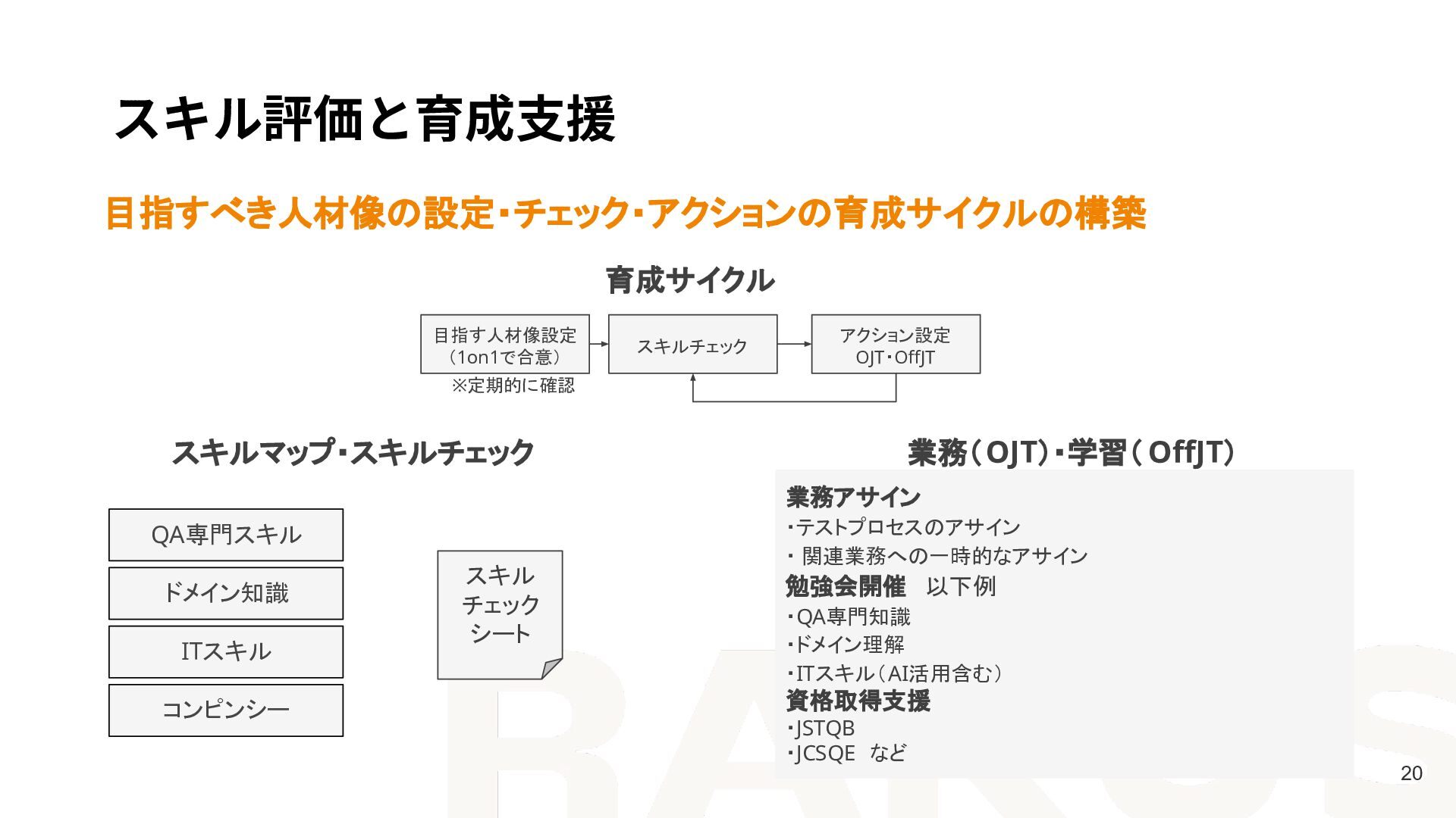 ・ 関連業務への一時的なアサイン 勉強会開催 以下例 ・QA専門知識 ・ドメイン理解 ・ITスキル(AI活用含む) 資格取得支援 ・JSTQB ・JCSQE など 育成サイクル 目指す人材像設定 (1on1で合意) スキル チェック シート 業務(OJT)・学習( OffJT) スキルチェック アクション設定 OJT・OffJT ※定期的に確認